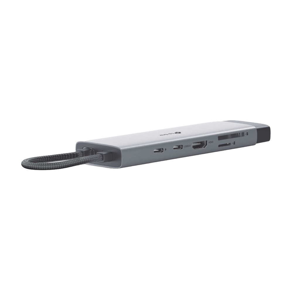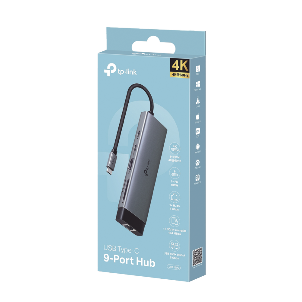 Adaptador HUB 9 en 1, 1 puerto USB-C entrada, 1 puerto HDMI 4K, 1 puerto Ethernet Gigabit, 1 puerto SD y MicroSD, 1 puerto USB-C y 3 puertos USB-A