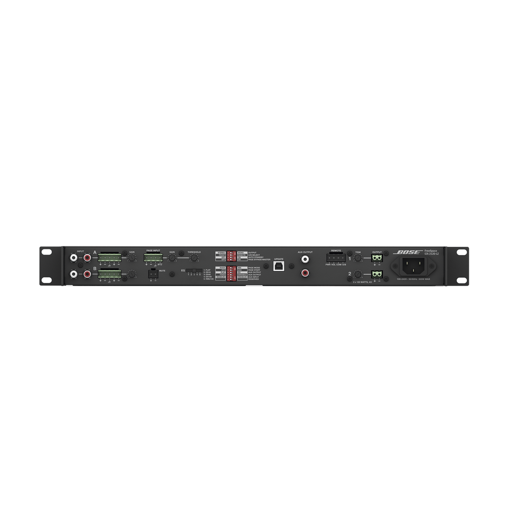 En el caso de aplicaciones de música en primer y segundo plano y de paginación, los amplificadores de zona integrados Bose® FreeSpace® IZA 2120-HZ mejoran la experiencia de audio cuando se usan los altavoces FreeSpace®. Los amplificadores FreeSpace IZA están optimizados para aplicaciones comerciales, cuentan con un ecualizador de altavoz seleccionable para enriquecer la calidad del audio, buscapersonas Opti-voice® para ofrecer una clara inteligibilidad de la voz y proporcionar transiciones uniformes, y el ecualizador Dynamic EQ para garantizar música equilibrada y completa a cualquier nivel de volumen.