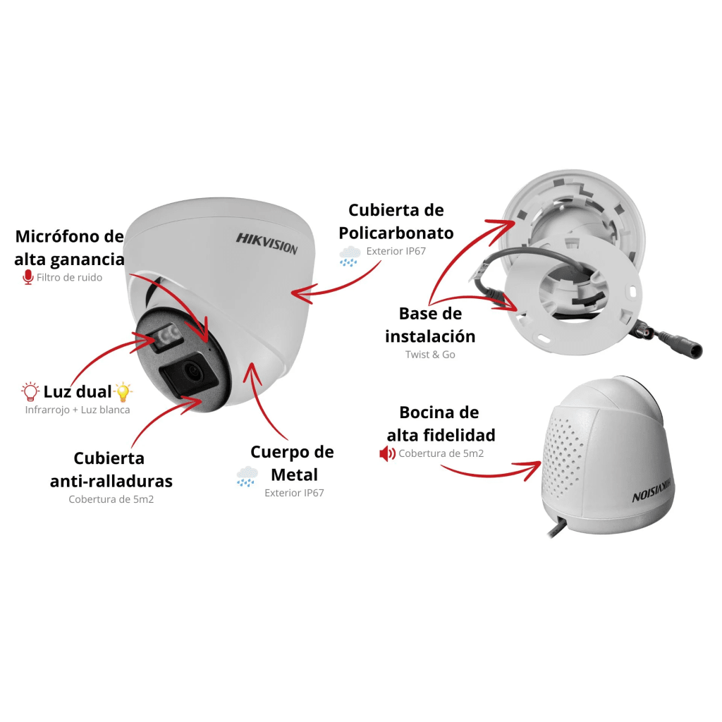 [Audio Bidireccional + Dual Light + ColorVu] Turret TURBOHD 4K (8 Megapixel) / Lente 2.8 mm / 40 mts IR EXIR + 40 mts Luz Blanca / Micrófono y Bocina Integrado / Exterior IP67 / dWDR