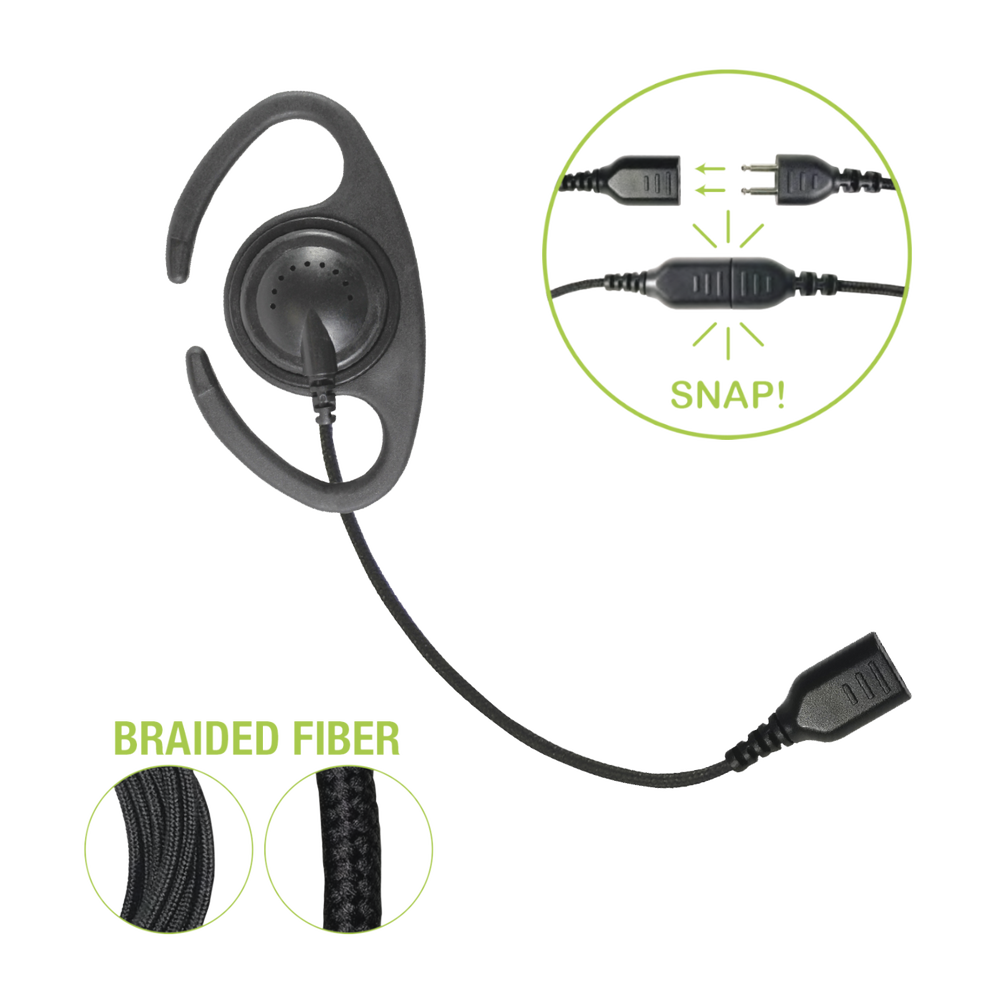 ???Auriculares de gancho en forma de “C” con cable de fibra trenzada y conector SNAP. Requiere micrófono de solapa de 1 o 2 hilos de la Serie SNAP.