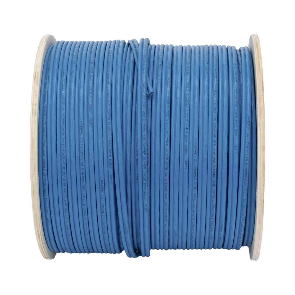 Bobina de Cable Siam?s Cat6 UTP 100% Cobre + 2 Cables Gruesos (18 AWG) para Alimentar C?maras M?s Lejos / 152 Metros (500 Pies) / Instalaci?n en Exterior / Uso Industrial para Climas Extremos