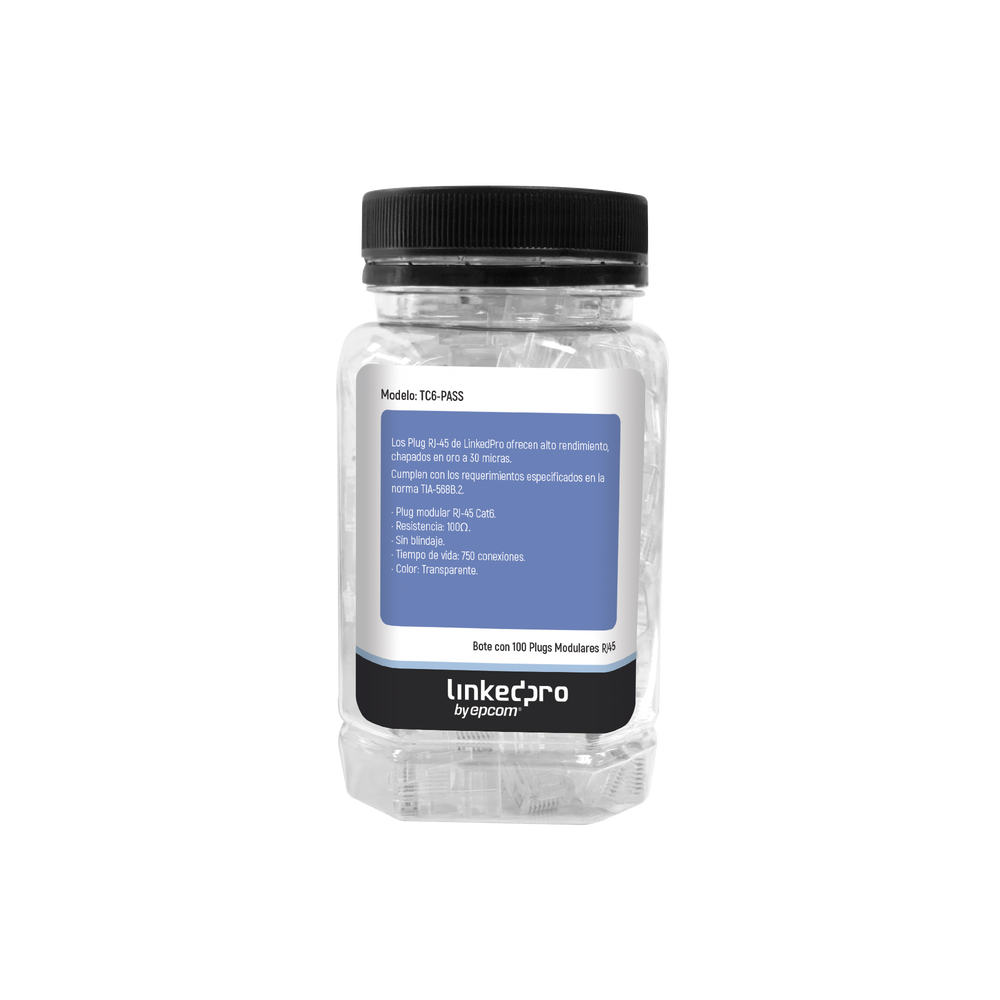 Terminaciones más rápidas, fáciles y eficientes con los plugs Pass through de LinkedPro, su diseño de una sola pieza permite que los cables pasen a través del conector de una manera eficiente, manteniendo alta integridad de señal.