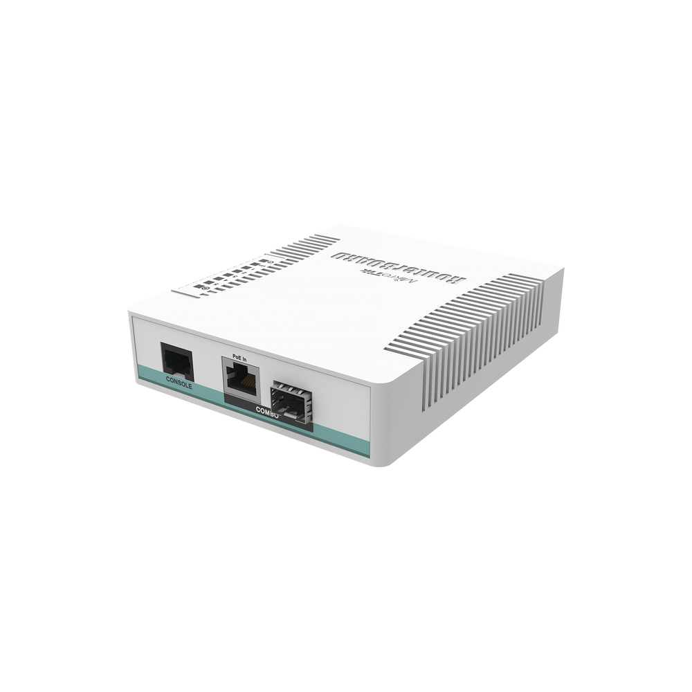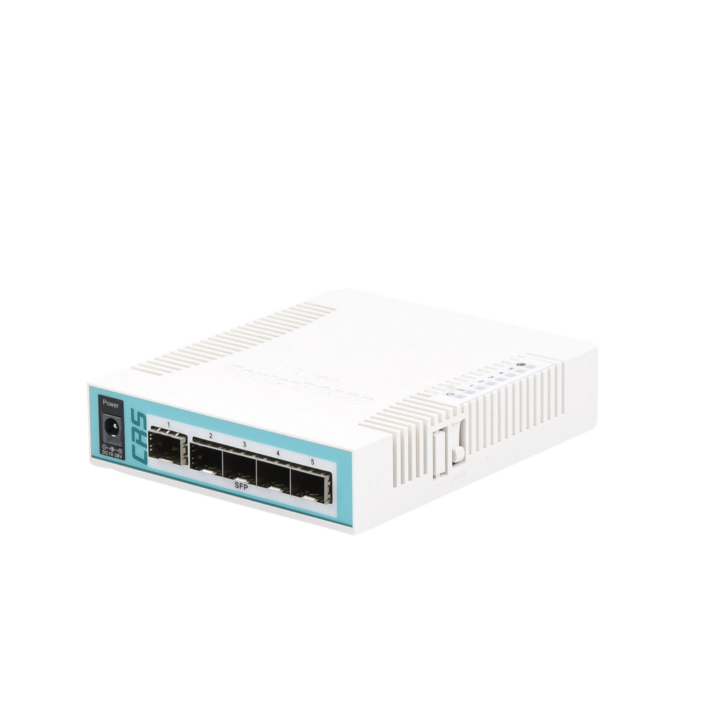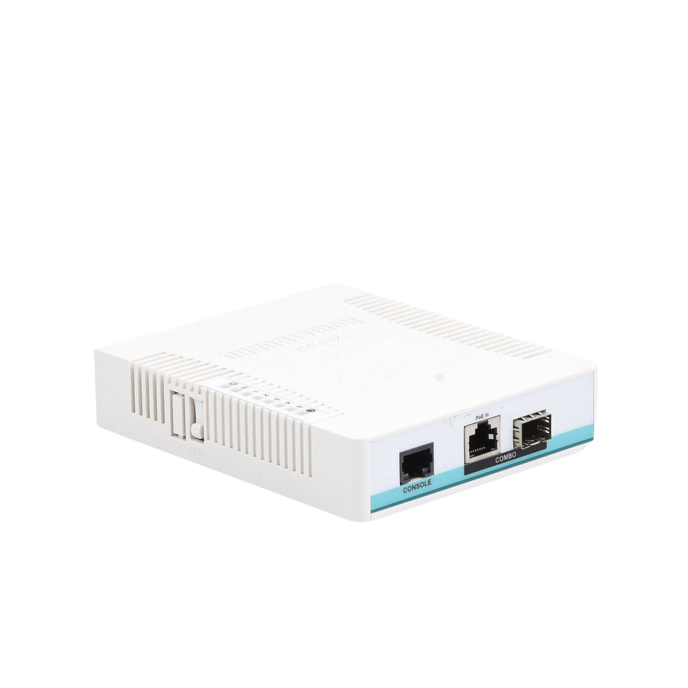 El Cloud Router Switch 106-1C-5S es un switch inteligente de tamaño de escritorio, equipado con un puerto combinado Gigabit Ethernet / SFP y cinco jaulas SFP de 1,25 Gbps. El paquete incluye una fuente de alimentación. Alimentado por una CPU de 400MHz y 128MB de RAM, ejecuta RouterOS con una licencia L5 y admite energía de 11 a 30 V.