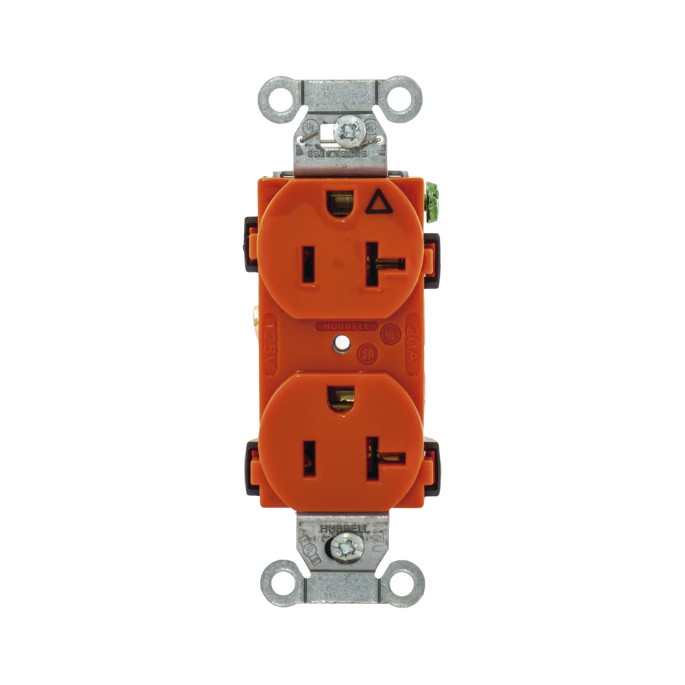 Contacto dúplex, grado comercial, 2 polos, 3 cables, 20A 125V, NEMA 5-20R, color naranja.