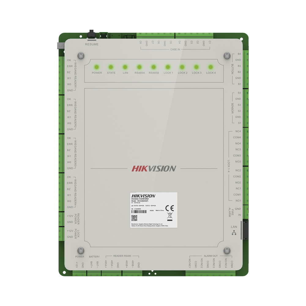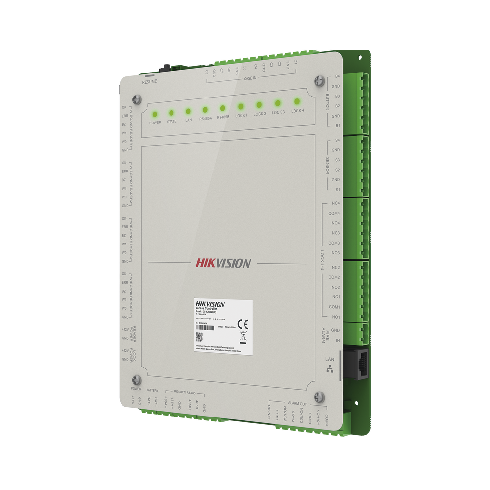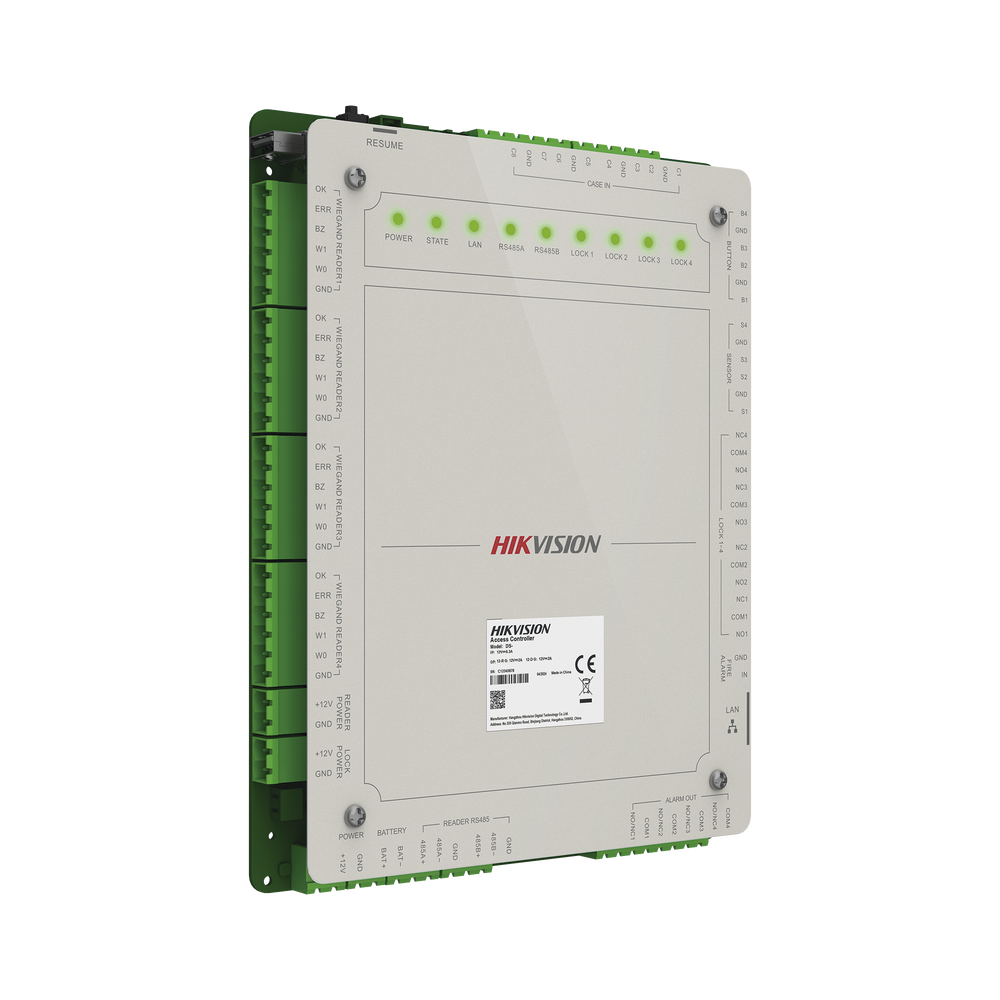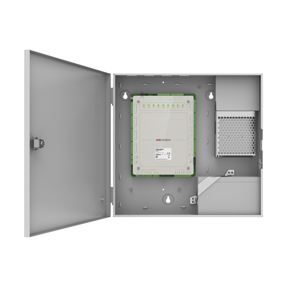 Controlador de Acceso 4 Puertas Administrable en la Nube con Hik-Connect Teams / Interfaz Web / 8 Lectores de Huella o Tarjeta / 100,000 Tarjetas / 10,000 Huellas / Incluye Gabinete y Fuente de Alimentación 12Vcd 8 A / Soporta Batería de Res