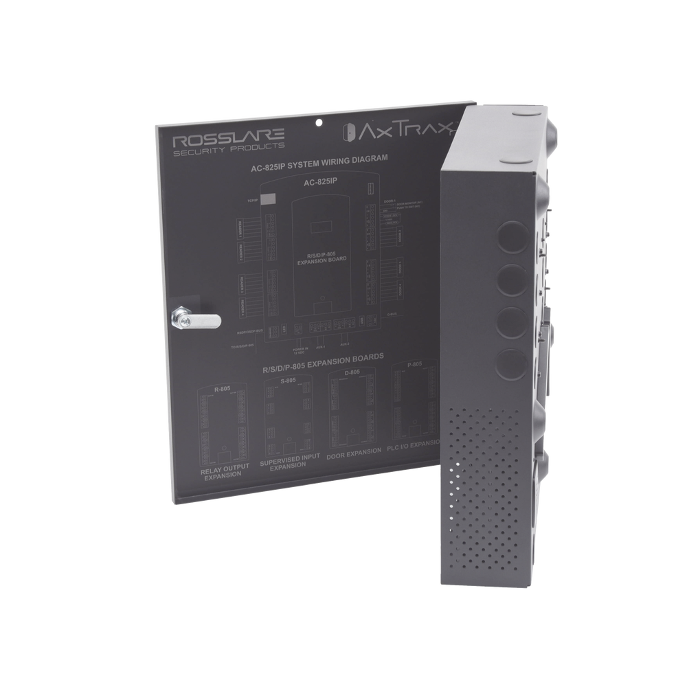 - Puerto de expansión interconstruido directamente en tablilla, el sistema puede alojar hasta 12 tarjetas expansoras vía OSDP (R/S/D/P-805) adicionales a la tarjeta expansora montada en el panel.