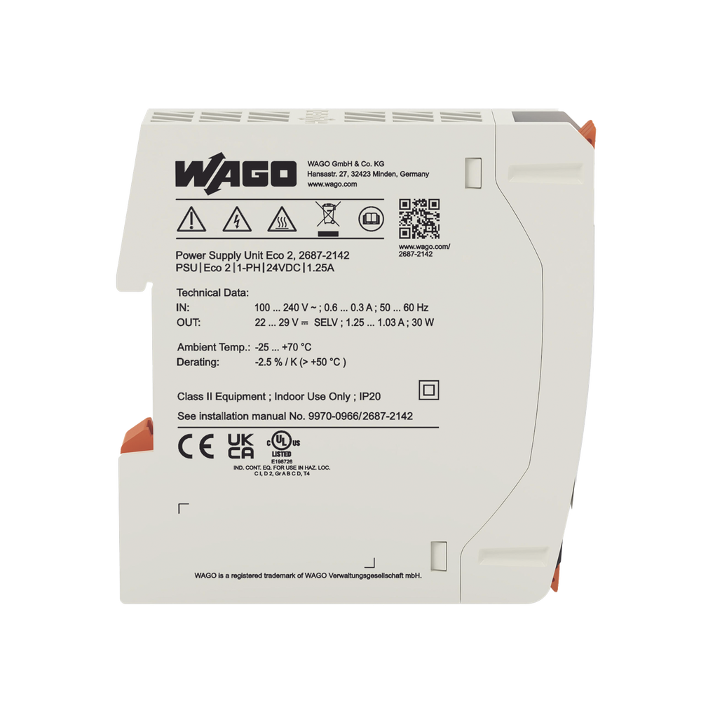 Fuente de Alimentación Eco 2 / Monofásica / 24V DC / 1.25A / 30W / Push-in CAGE CLAMP® / Carril DIN / SELV-PELV / IP20