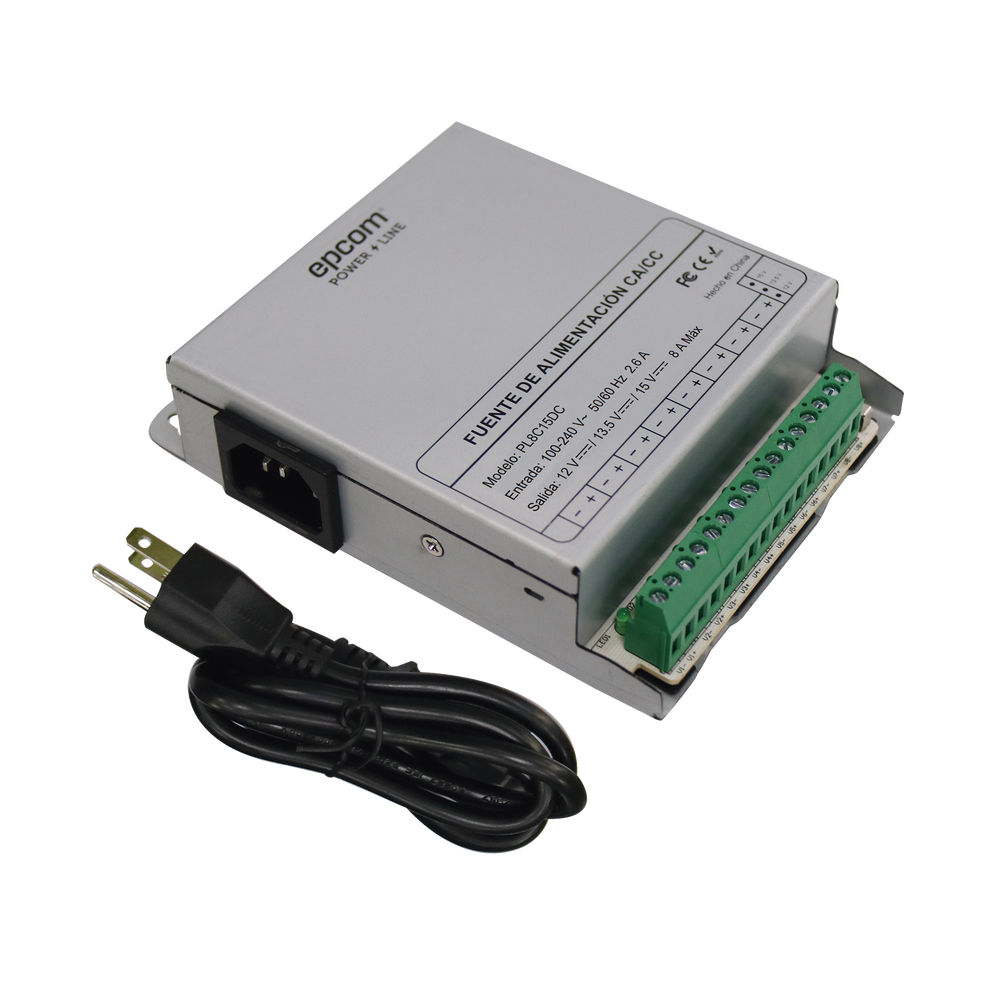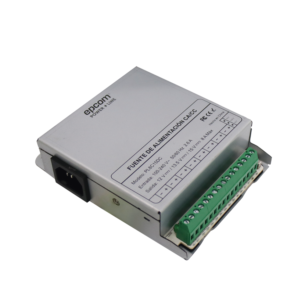 Fuente de Poder Metálica / Para 8 Cámaras / Ajustables a 12 o 13.5 o 15 Vcc / 8 Amperes / Instalación en Pared.