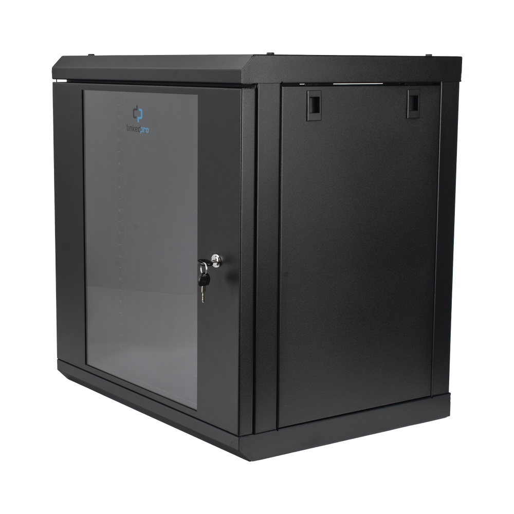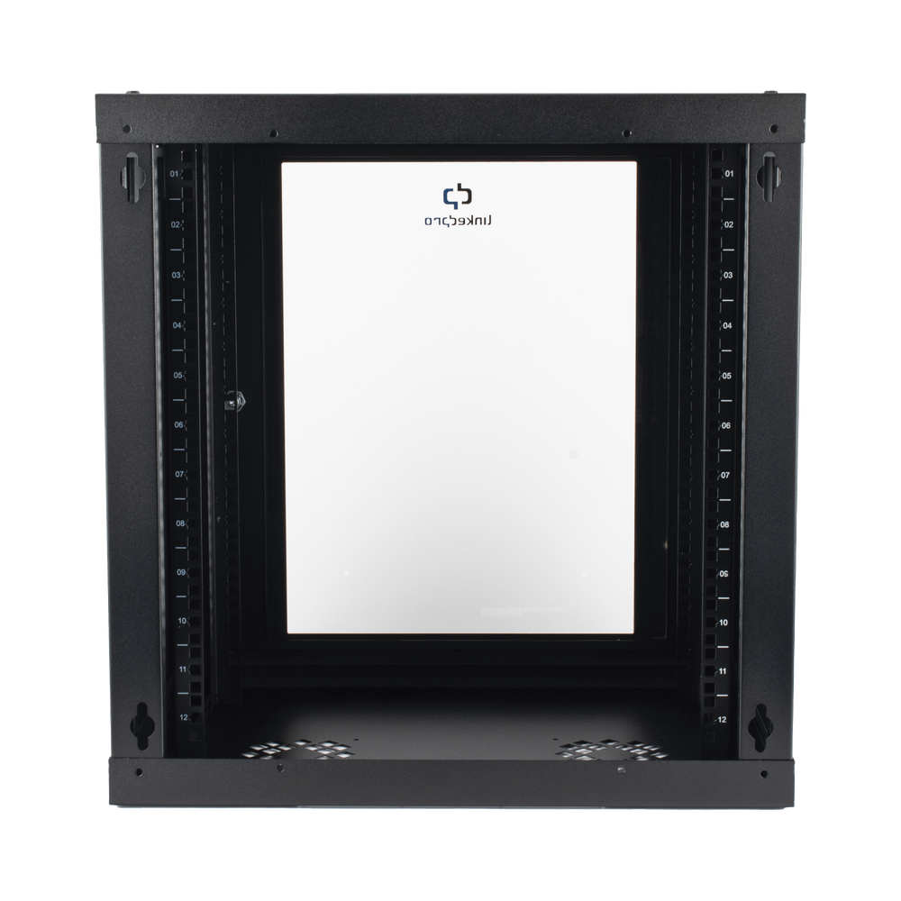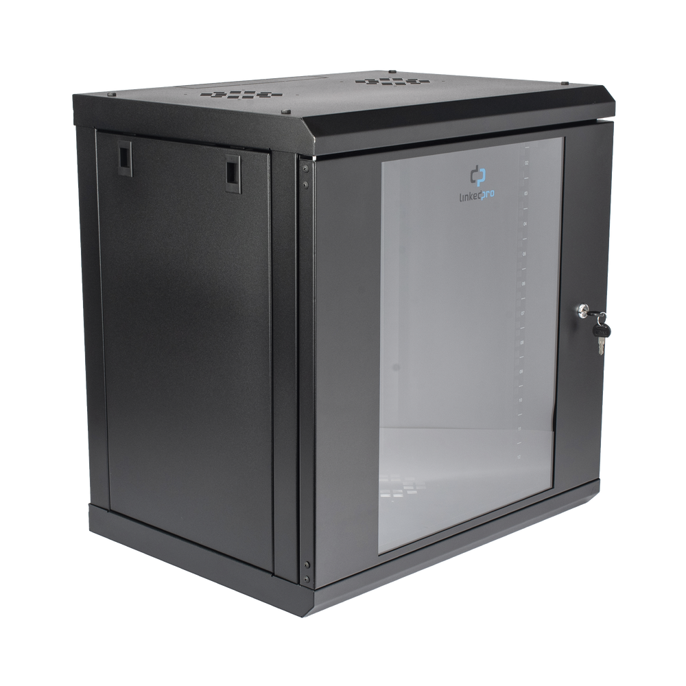 Gabinete de Pared de 12U con Puerta de Cristal Templado, 455 mm de Profundidad, Rack de 19”, Acero Reforzado Color Negro.