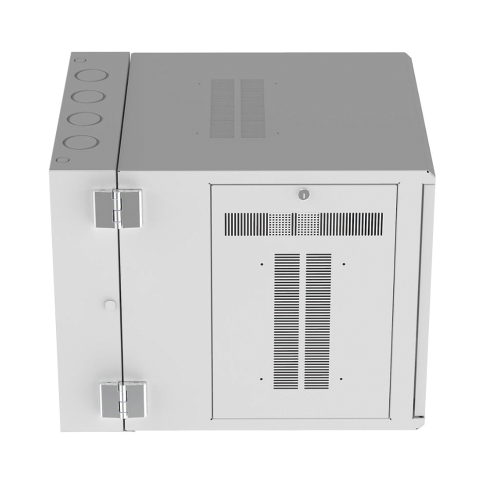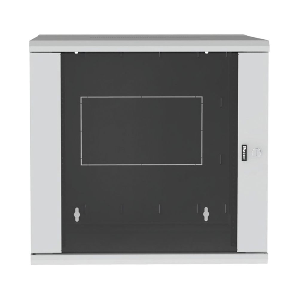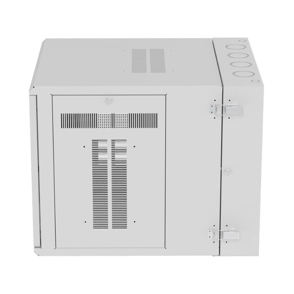 Gabinete de montaje en pared construido en acero, soporta 12 unidades de Rack para equipos de red activos o pasivos. Cuenta con paneles laterales totalmente desmontables y está diseñado para permitir el control de clima adecuado para uso con diversos equipos de red, así como Switches de alimentación remota (PoE) y fuentes de alimentación ininterrumpida (UPS).