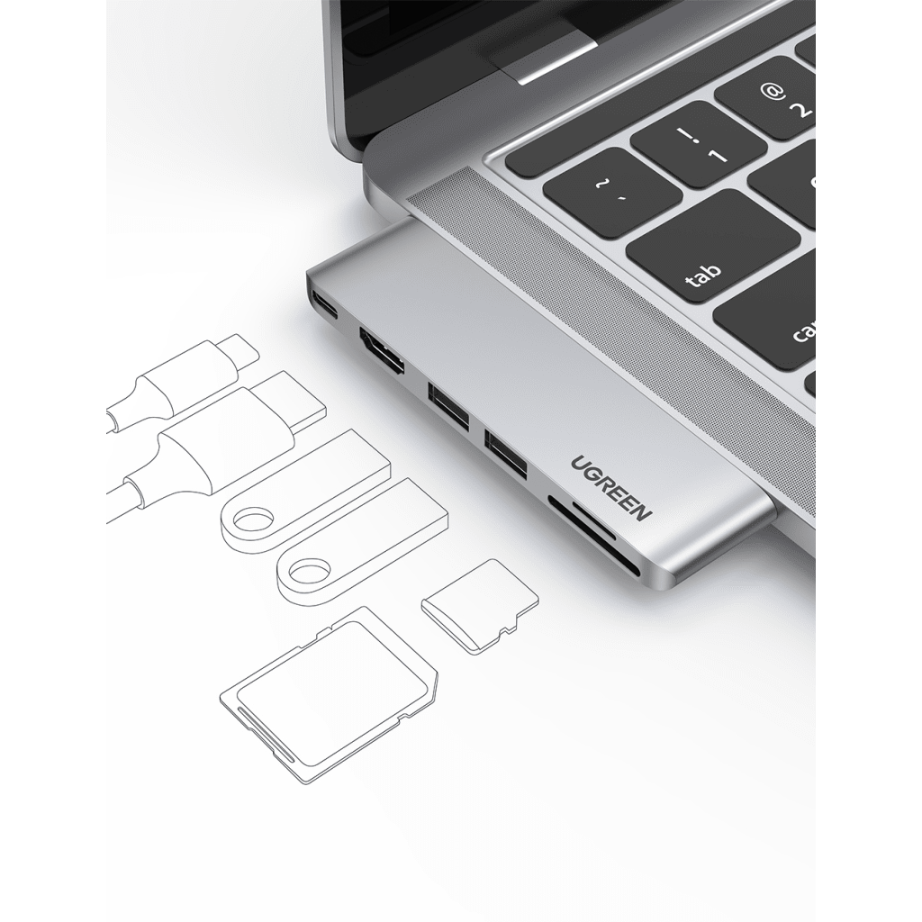 Hub USB-C 6 en 1 / 2xUSB-A 3.0 (5Gbps) / HDMI 4K@30Hz / Puerto PD 100W / Lector SD+MicroSD / Aluminio / Compatible Thunderbolt 3 / Compacto 110x29x8.5mm