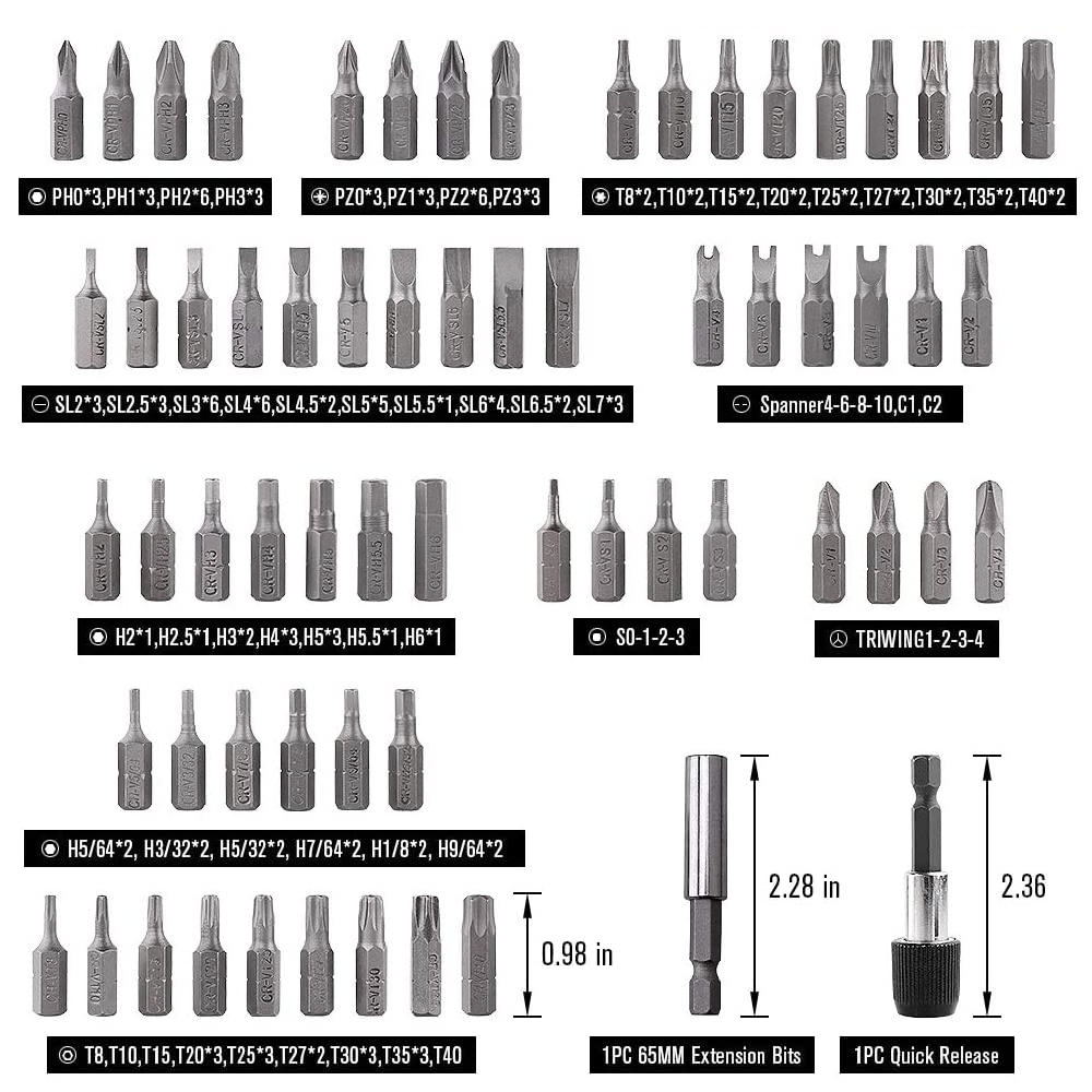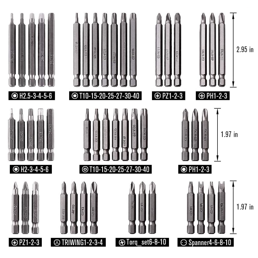 - Juego de 208 puntas de destornillador, incluye Phillips, plano ranurado, cuadrado, Pozi drive, llave de tuercas, Torq, Tri-wing, Torx star, cabeza hexagonal, Tamper proof Torx star, en una variedad de tamaños para una cobertura total.