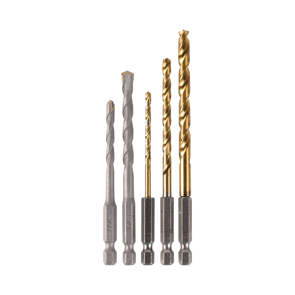Juego de 5 Brocas con Inserción Hexagonal de 1/4″. De concreto: 3/16″ y 1/4″. Para metal: 1/8″, 3/16″ y 1/4″.