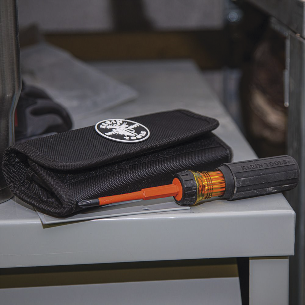 • Juego de desarmadores intercambiables con aislamiento, un mango con aislamiento, 5 barras intercambiables con aislamiento y un estuche de transporte.