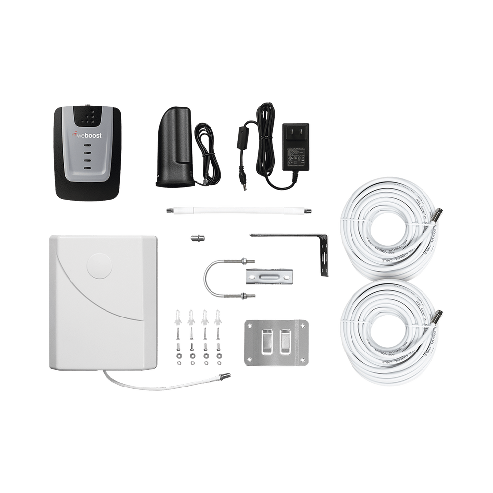 Amplificador de señal, antena interior para escritorio con cable de 1.52 m y conector SMA macho, fuente de alimentación CA a CD, antena exterior tipo panel para montarse en tubo, dos cables coaxiales tipo RG6 de 9.14 m c/u y un cable plano para unirlos.