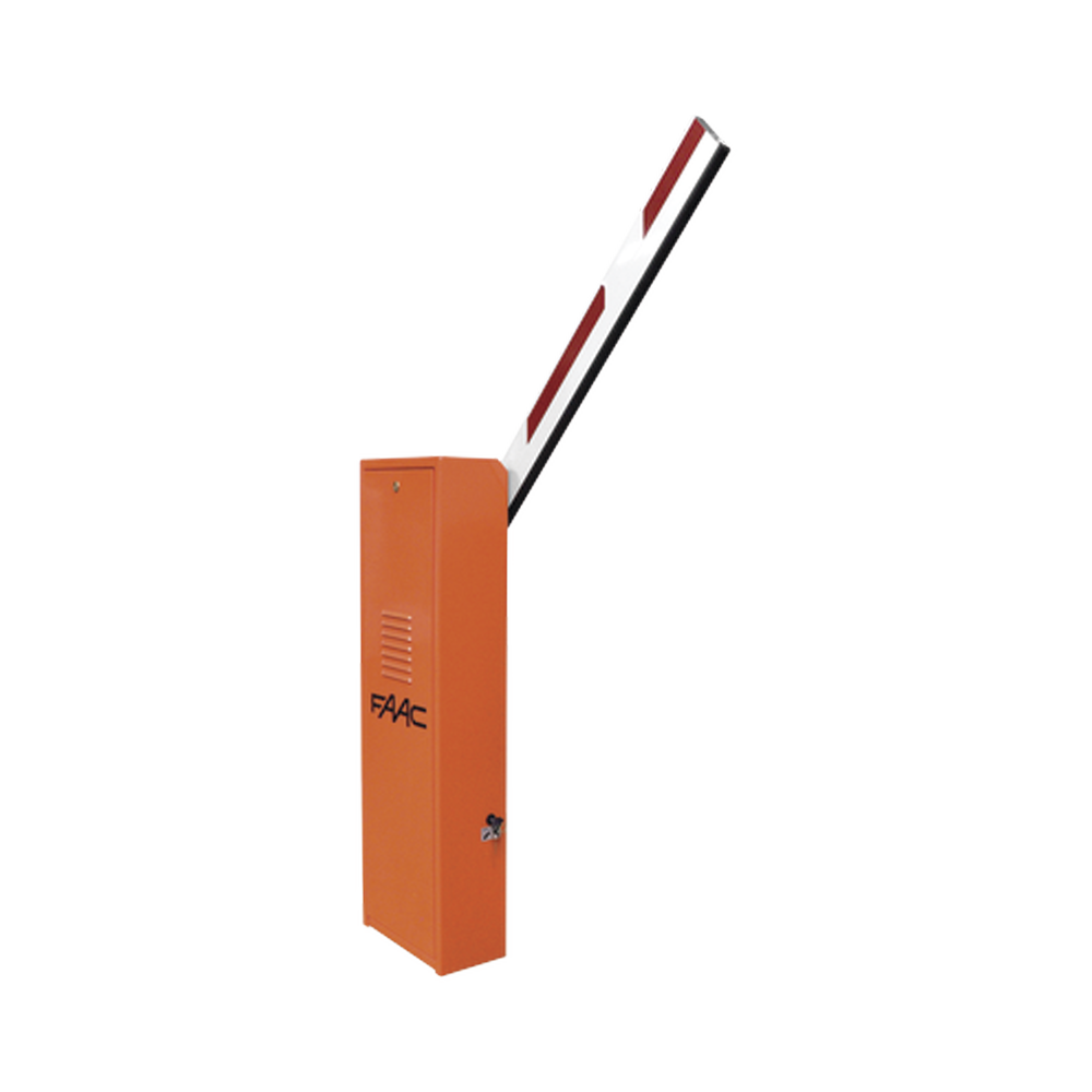 La gama de barreras FAAC está dotada de un seguro hidráulico anti aplastamiento, bloqueo de retención en cierre y apertura, desbloqueo manual con llave triangular, gabinete en acero resistente a colisiones.