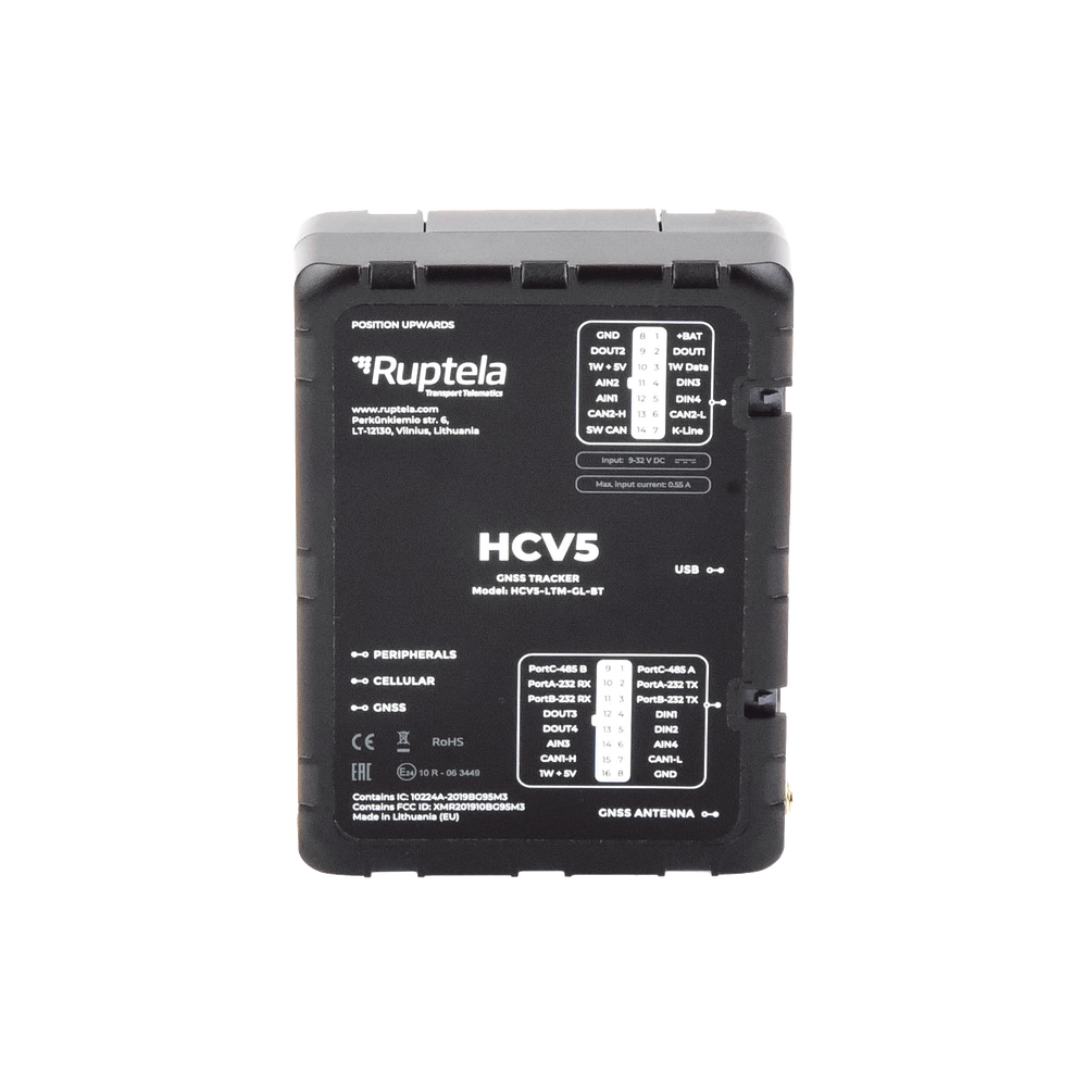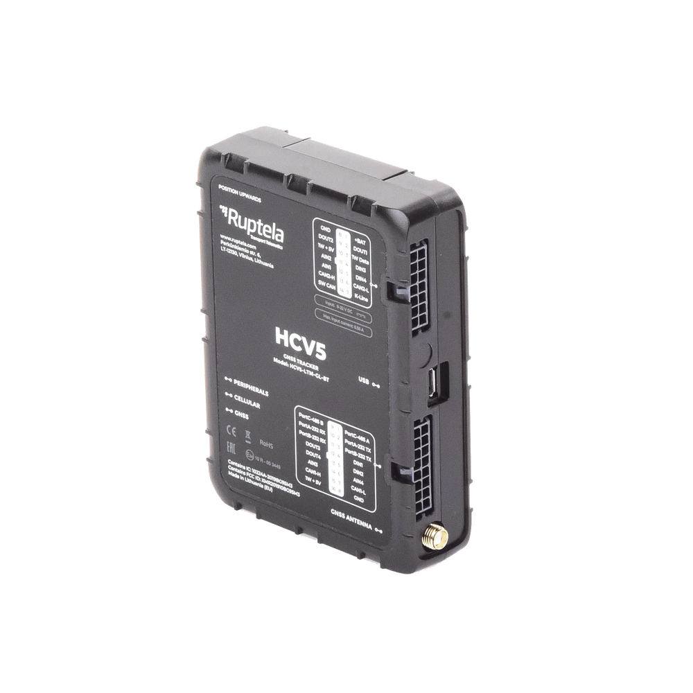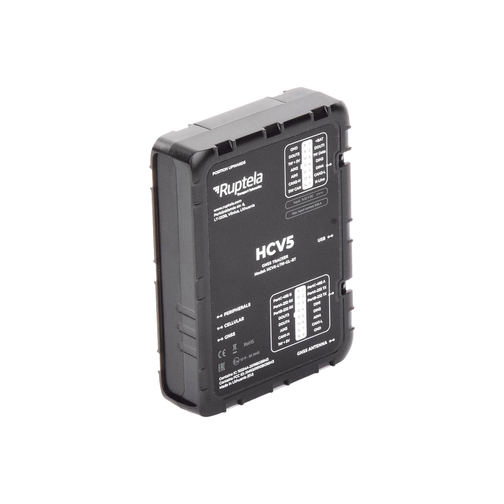 El dispositivo HCV5 es un rastreador GPS para vehículos pesados. Se ha diseñado para rastrear y monitorear vehículos y puede leer datos de los protocolos estándares de CANbus como FMS, J1708 y J1939.