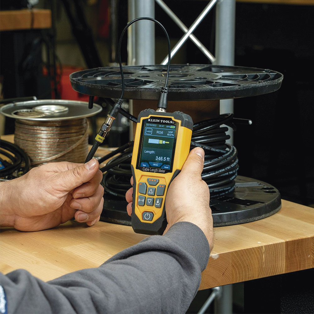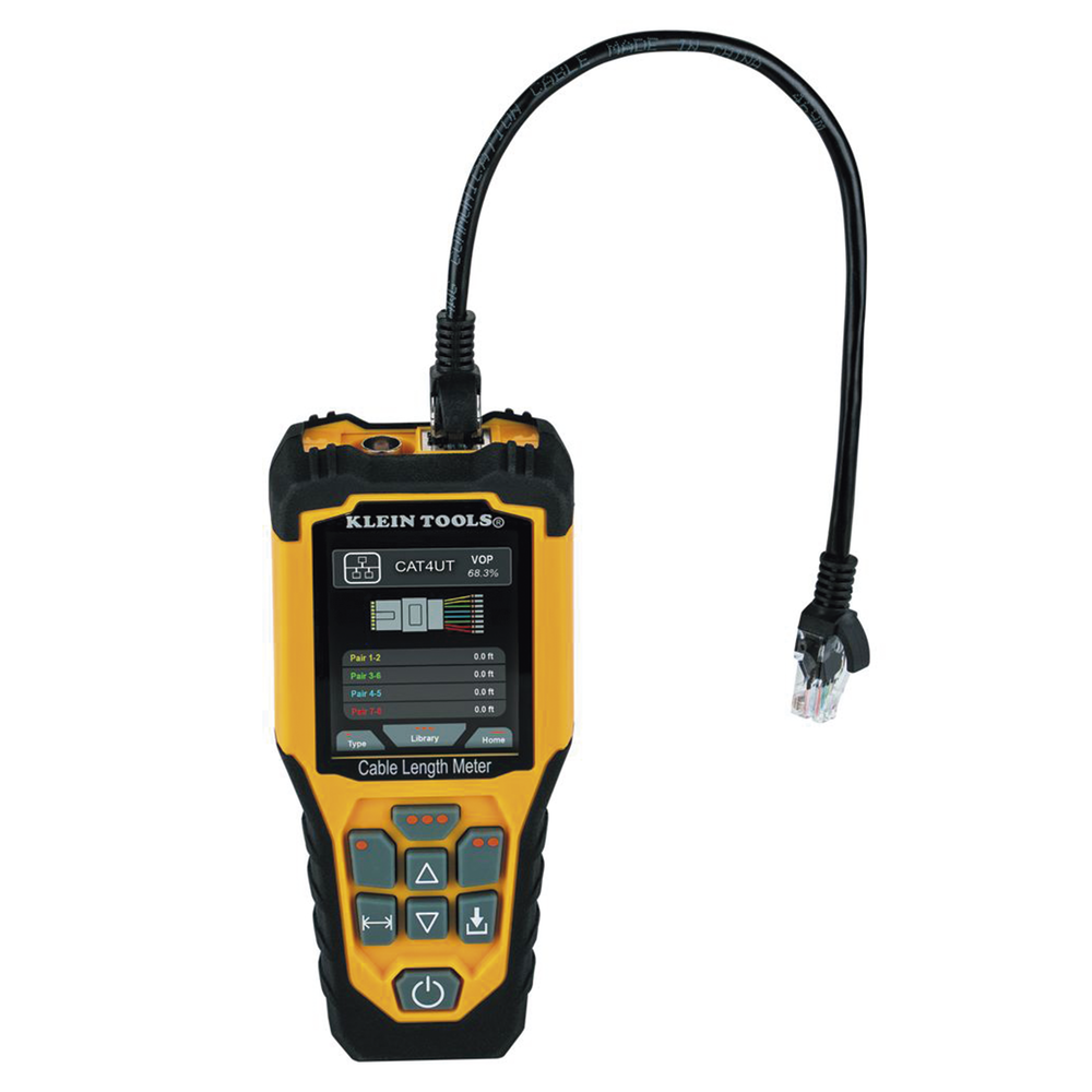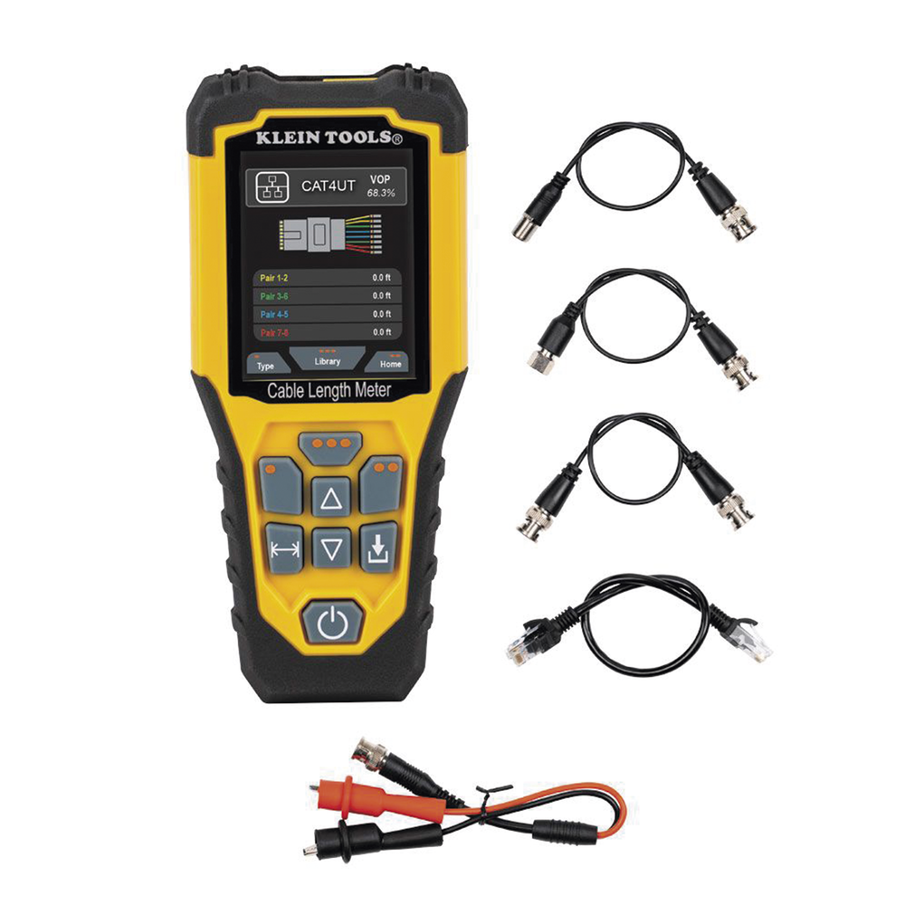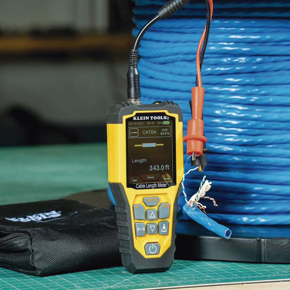 El medidor de longitud de cable Klein Tools es un probador portátil o Reflectómetro de Dominio Temporal (TDR, por sus siglas en inglés) basado en el método de Reflectometría. Dicho método funciona mediante la emisión de señales o impulsos eléctricos diseñado para medir el tiempo transcurrido entre el ‘pulso incidente’ (inicial) y el ‘pulso reflejado’ (final o eco). La diferencia de tiempo entre uno y otro se traduce en unidades de longitud (píes o metros y en unidades métricas o imperiales). El TDR permite de forma rápida y con gran precisión (+/- 2%), medir la longitud en cables eléctricos, de datos, de dos hilos y Romex® en un rango de distancia de hasta 914 m.