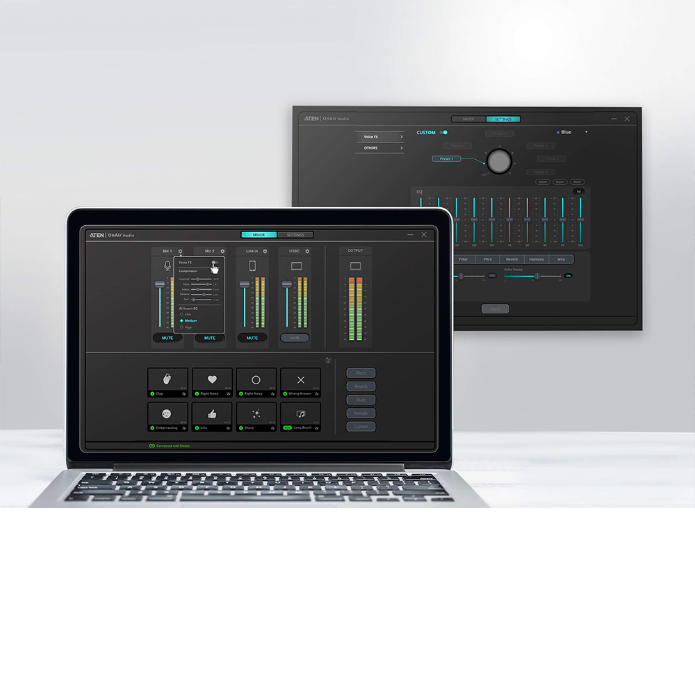 El MicLIVE de 6 canales es el primer mezclador de audio optimizado con IA del sector para la grabación de pódcasts, ya que adopta la tecnología de ecualización inteligente para ofrecer una mejora acústica para una experiencia de grabación de voz optimizada. Este mezclador de audio integra el equipo de mezcla de audio en una carcasa de caja de escenario compacta y ofrece hasta 6 entradas de audio de canal, un DSP incorporado y un convertidor AD/DA y agrega audio hasta 24 bits/96 kHz a cualquier ordenador portátil o tableta con USB-C.