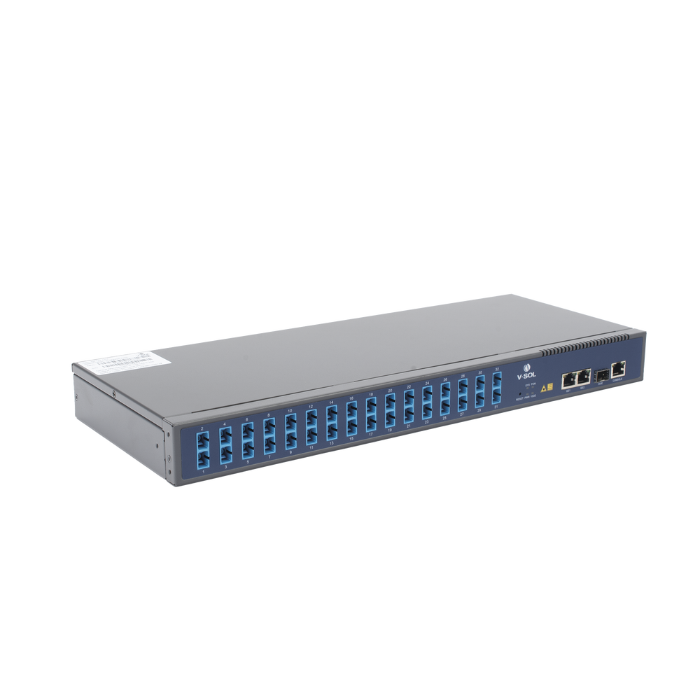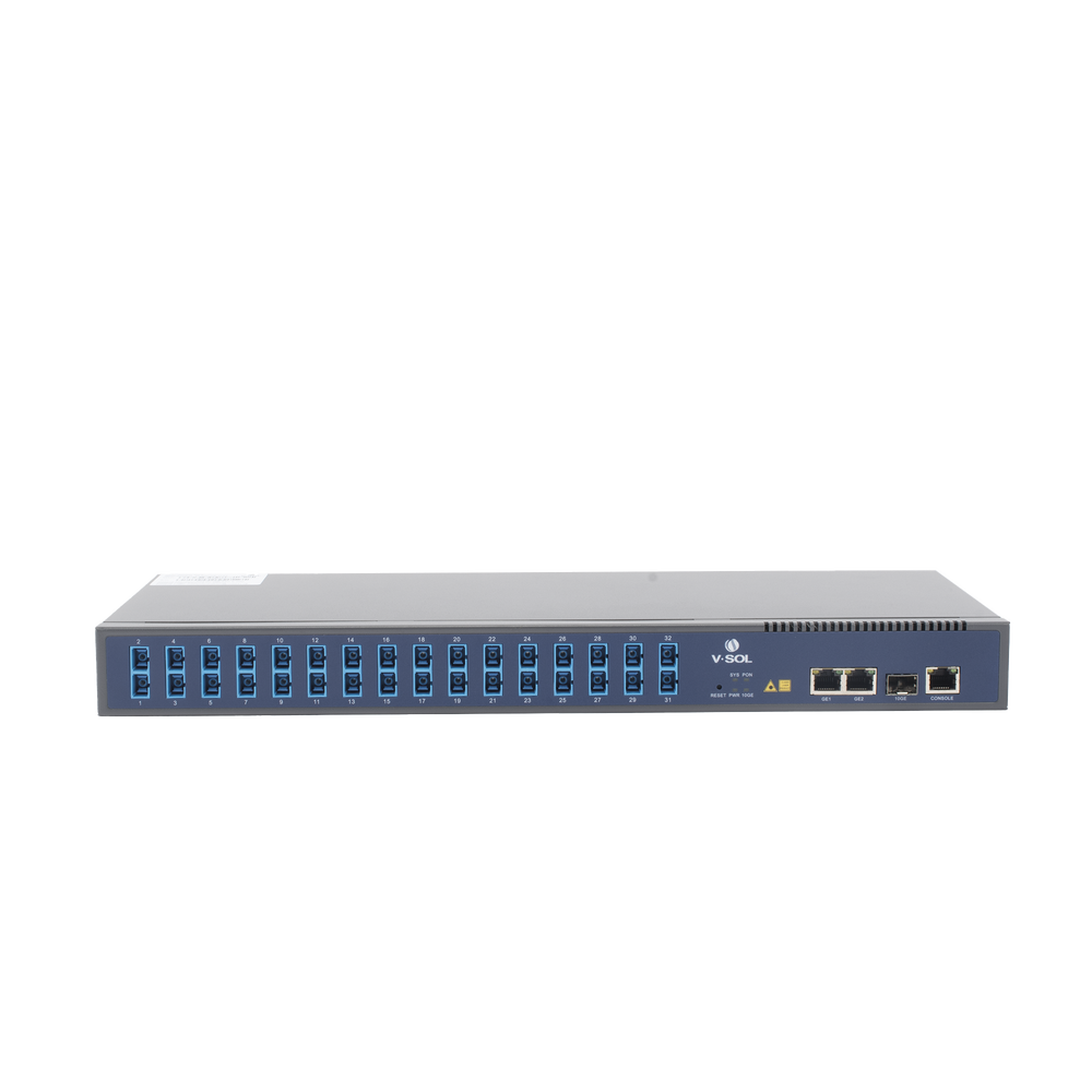 OLT de 1 GPON puerto con Splitter de 1 a 32 SC/UPC Incluido + 3 puertos Uplink (2 puertos Gigabit Ethernet + 1 puerto SFP/SFP+) , hasta 128 ONUS