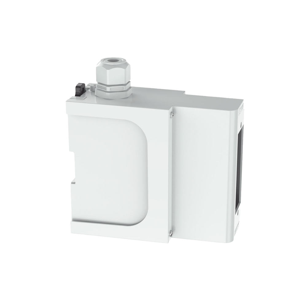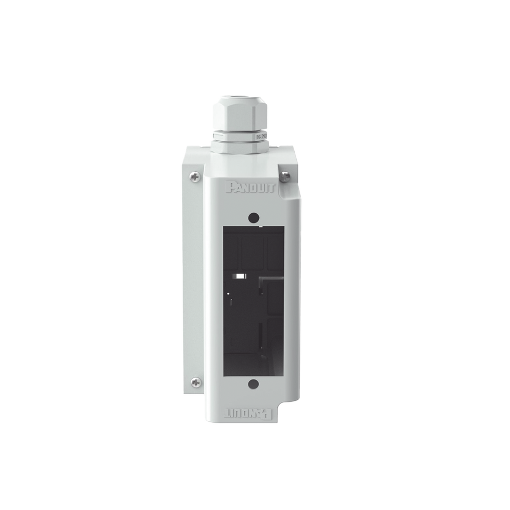 Este gabinete de montaje en riel DIN incluye una glándula de entrada de cables PG21 que incluye dos inserciones para usar con una variedad de cables de fibra, y tornillos de cabeza Phillips de 6-32 × 3/8′ para montar la placa frontal en el panel de conexiones.