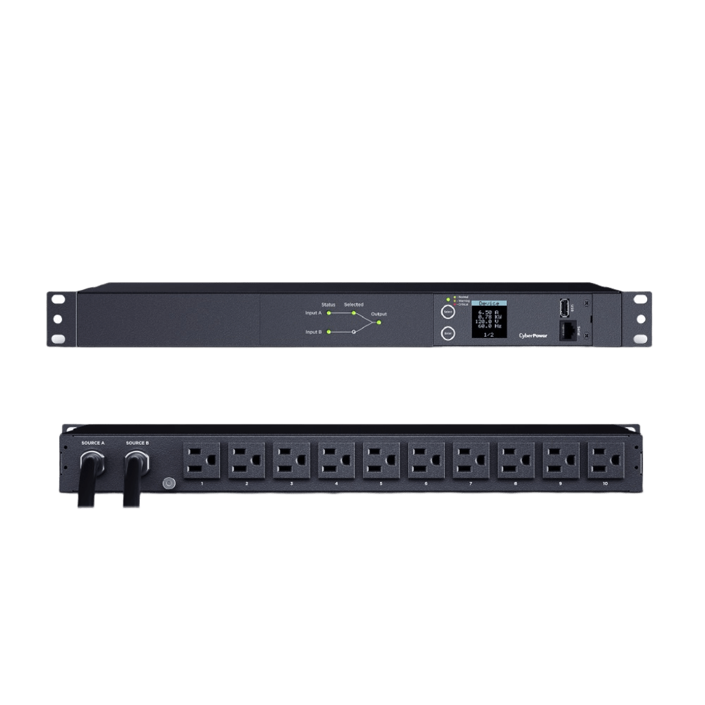 PDU ATS (Fuente Redundante Auto-transferible) Medible, Para Distribución de Energía, 2 Entradas 120 Vca NEMA5-15P, Con 10 Salidas NEMA 5-15R, Horizontal 19in, 1UR