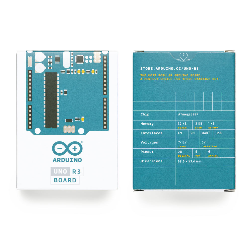 La placa Arduino UNO R3 es la plataforma de desarrollo insignia de Arduino, diseñada para aplicaciones de educación, makers e industriales. Equipada con el microcontrolador ATmega328P operando a 16 MHz, ofrece 32 KB de memoria Flash, 2 KB de SRAM y 1 KB de EEPROM. Incluye 14 pines digitales de entrada/salida (6 con capacidad PWM), 6 entradas analógicas, interfaz USB-B para programación y alimentación, y conectores ICSP para programación en circuito. La arquitectura incorpora un procesador secundario ATmega16U2 para la comunicación USB, proporcionando una solución robusta y versátil para proyectos de electrónica y prototipado.
