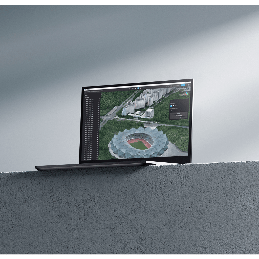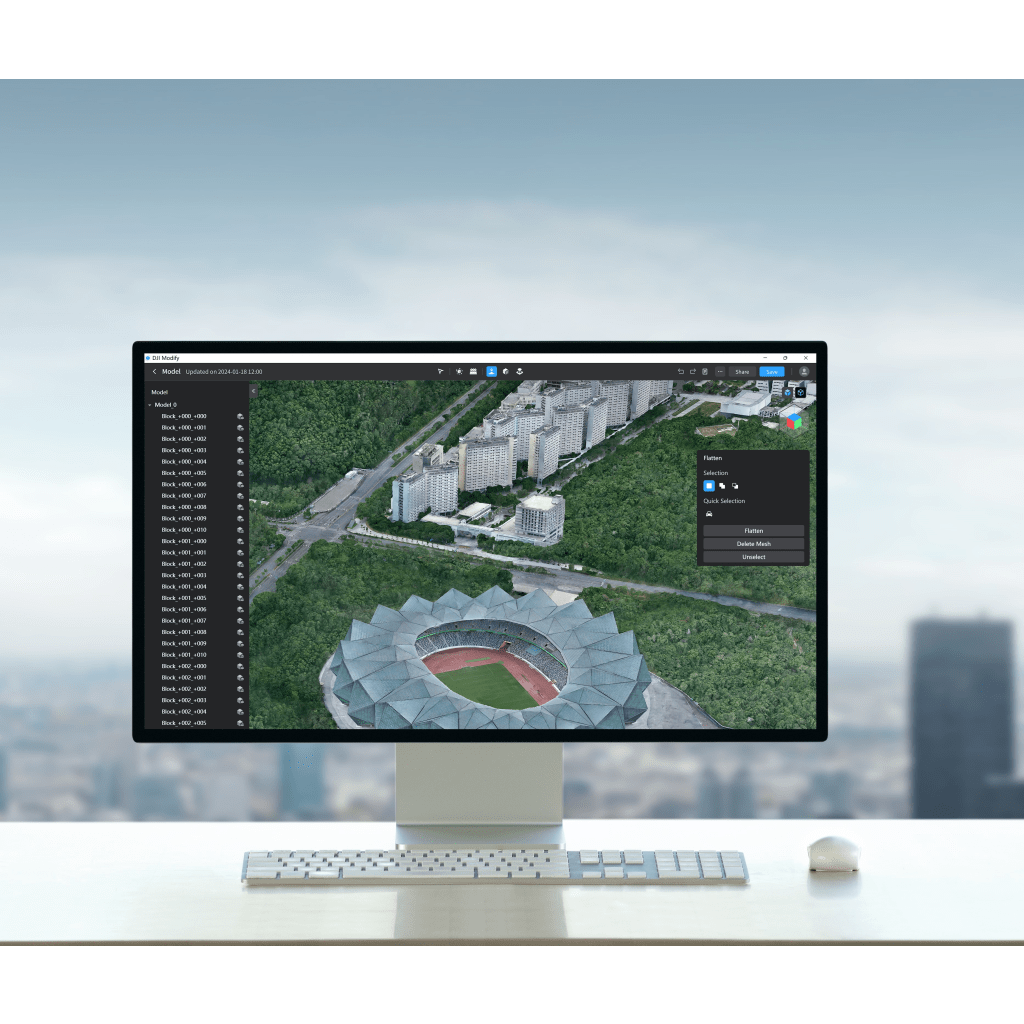Reparación eficiente de modelos: DJI Modify admite diversas funciones de edición, como la eliminación de piezas flotantes, el aplanamiento de superficies, la reparación de texturas, el relleno de agujeros y la reparación de la superficie del agua, lo que proporciona modelos bien editados con alta eficiencia.