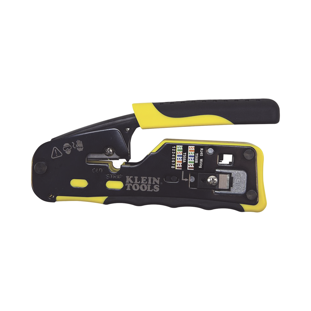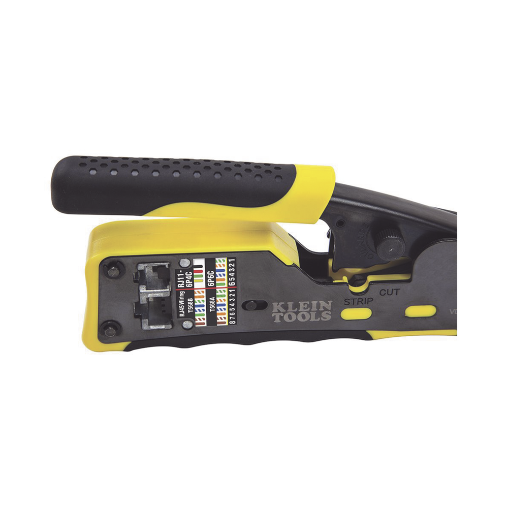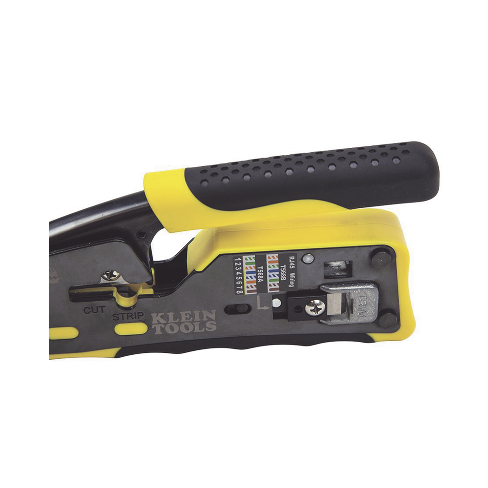 - Poncha conectores modulares de 4, 6 y 8 posiciones (conectores estándar RJ11/RJ12 y conectores RJ45 Pass-Thru™ de Klein Tools)