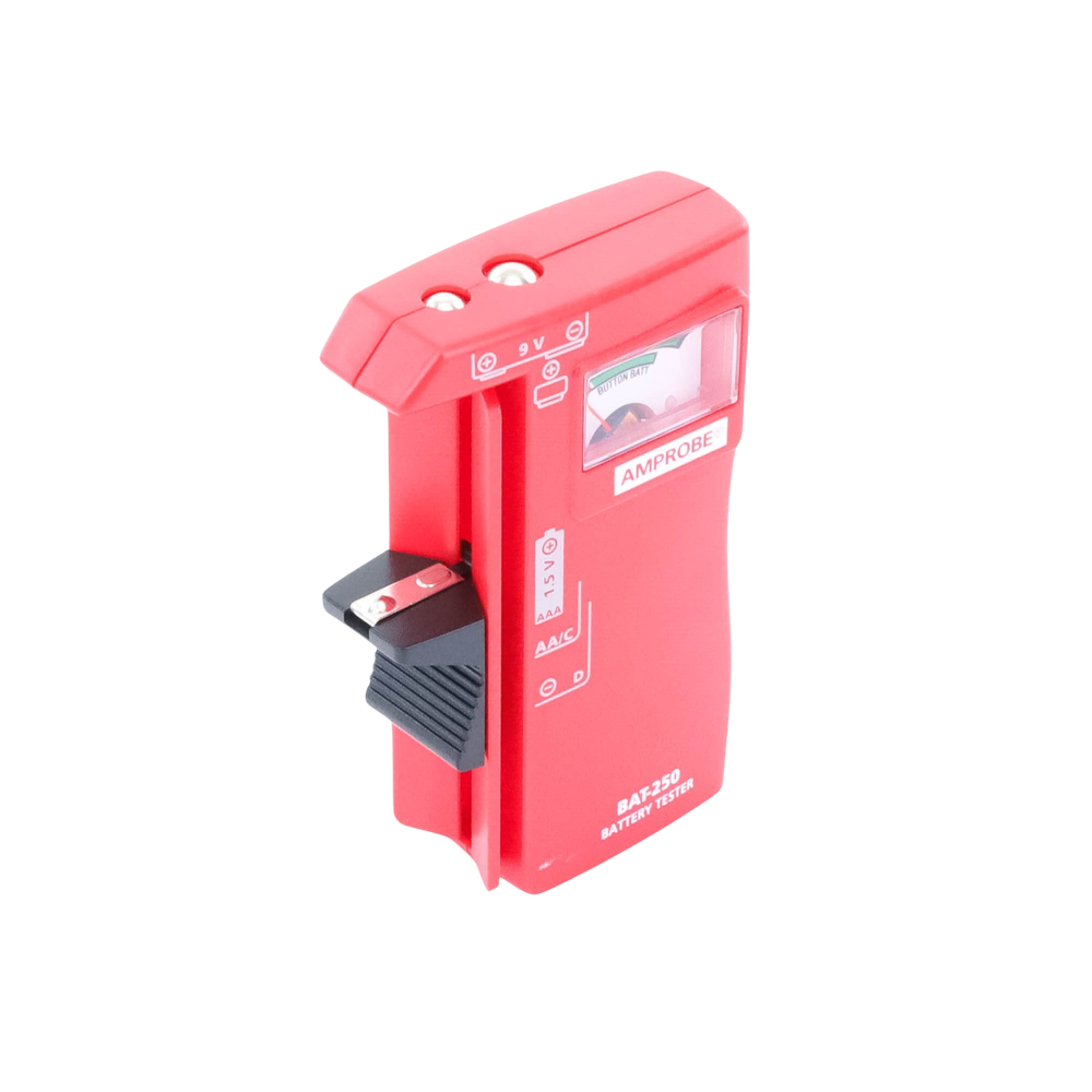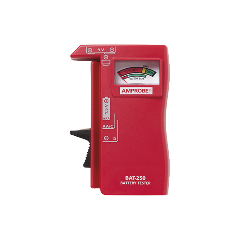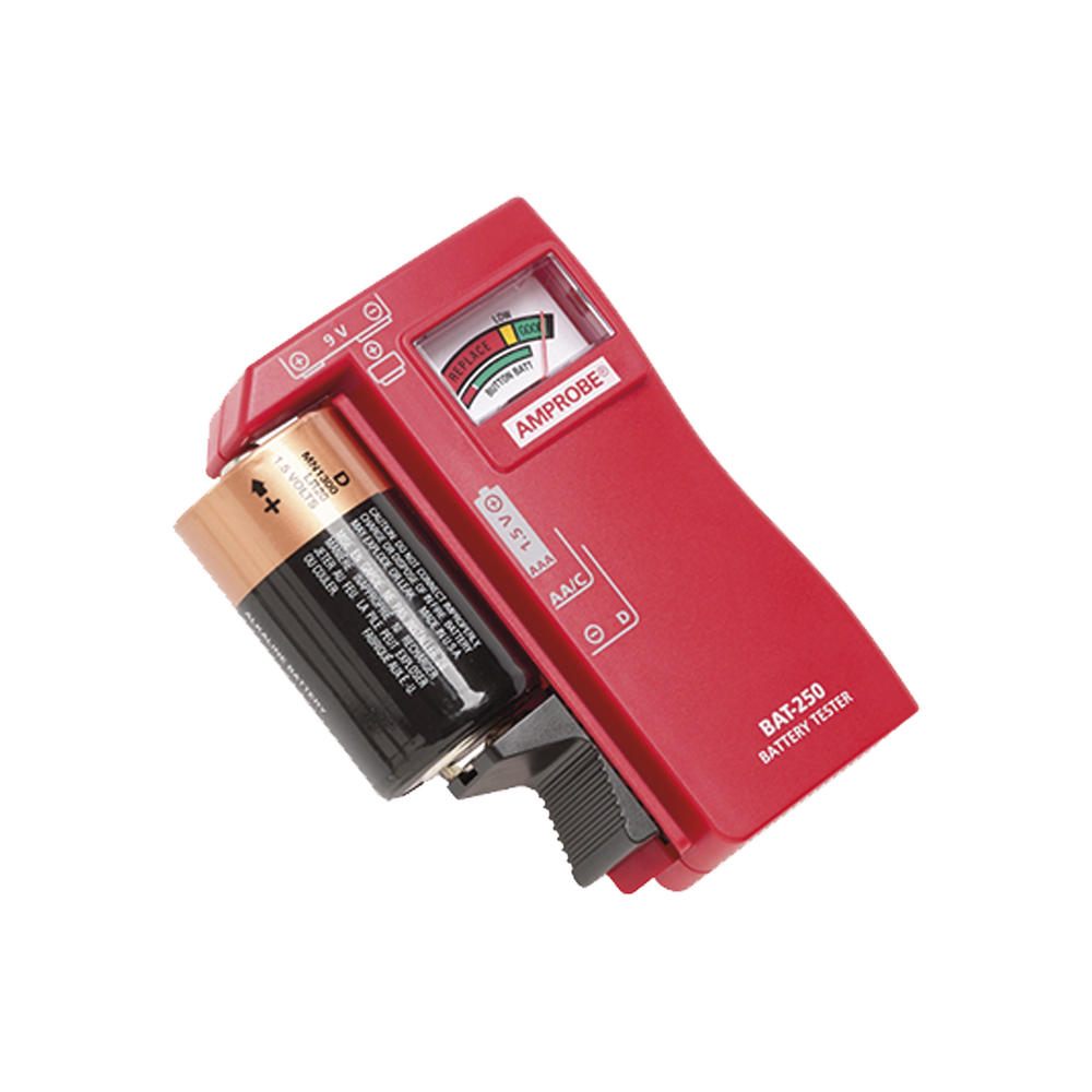 El probador de batería Amprobe BAT-250 está diseñado para mediciones de batería con una mano, cómodas y fiables. El probador diseñado de forma única ofrece un deslizador ergonómico y un espacio lateral en forma de v para mantener mejor las baterías en su lugar durante las pruebas y una forma contorneada que se ajusta perfectamente en su mano. Probando baterías nunca había sido más fácil.