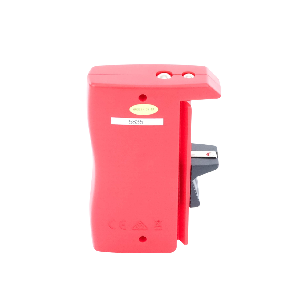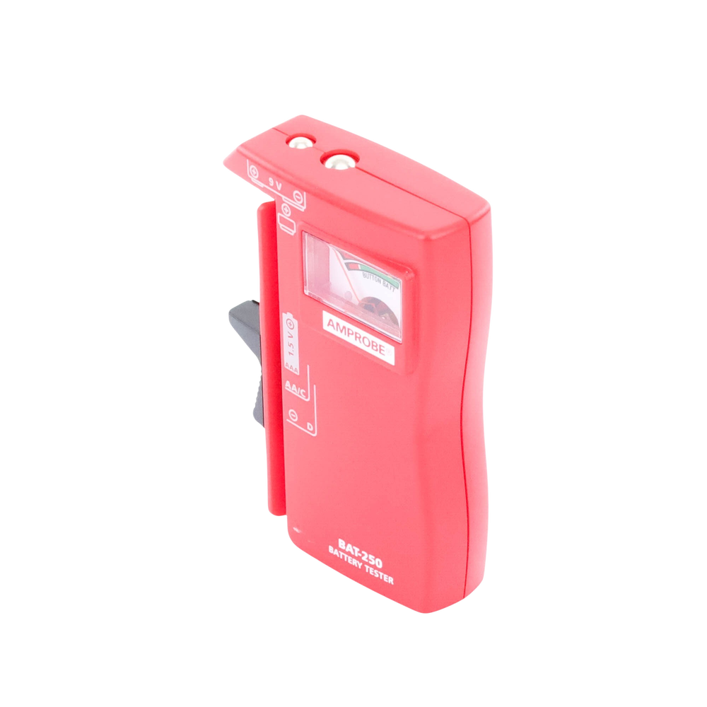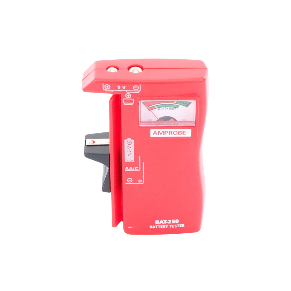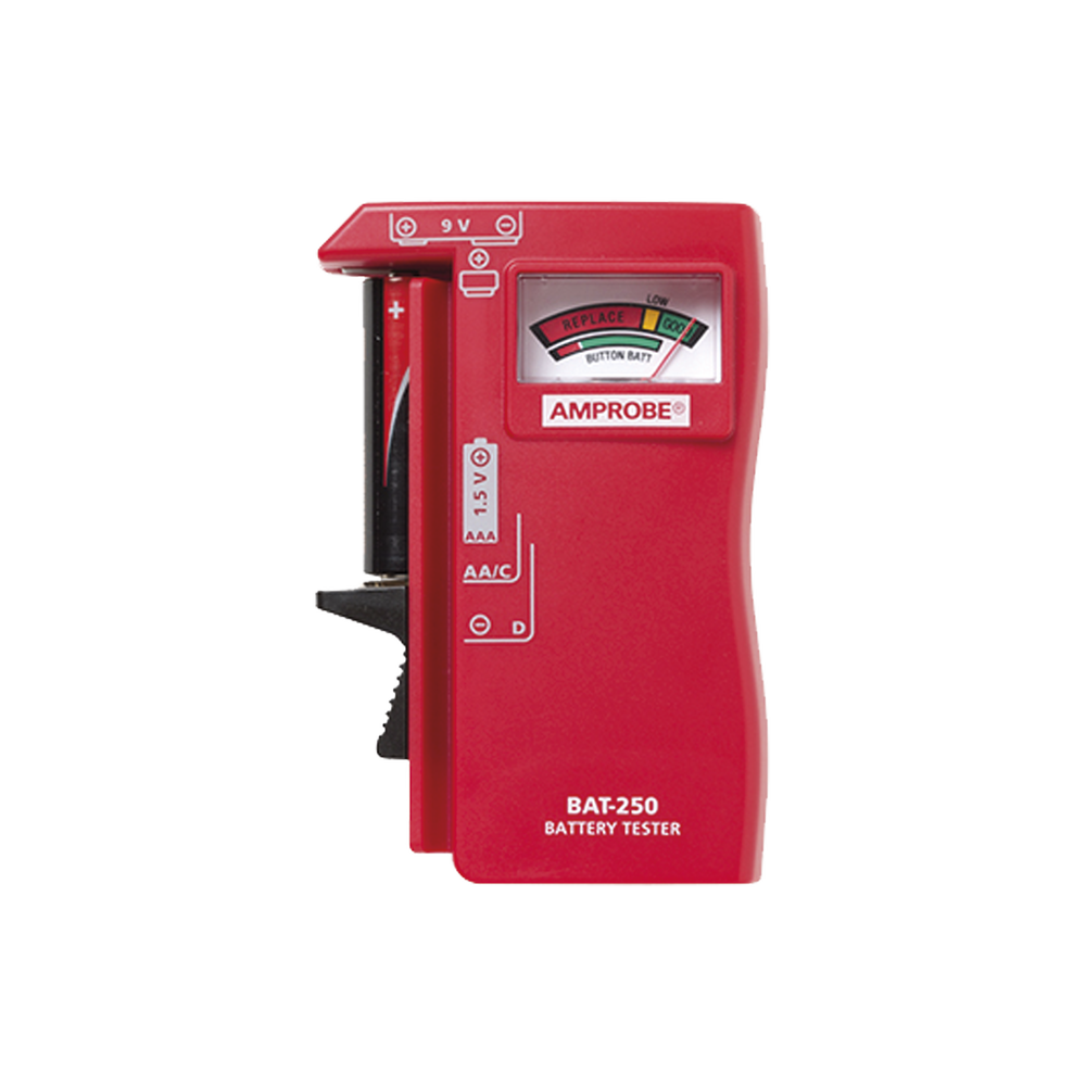 El probador de batería Amprobe BAT-250 está diseñado para mediciones de batería con una mano, cómodas y fiables. El probador diseñado de forma única ofrece un deslizador ergonómico y un espacio lateral en forma de v para mantener mejor las baterías en su lugar durante las pruebas y una forma contorneada que se ajusta perfectamente en su mano. Probando baterías nunca había sido más fácil.