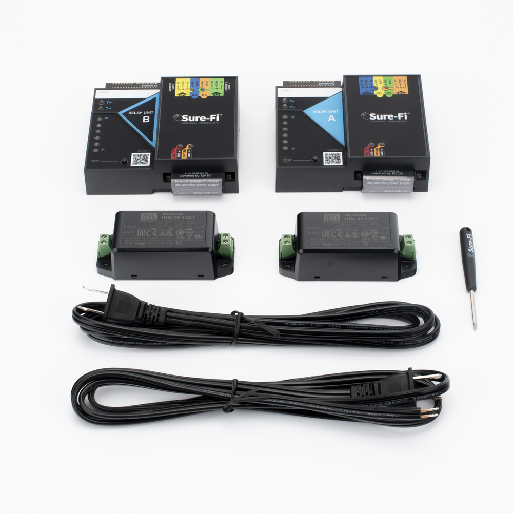 - 1 – Sistema de Puente de Relé Inalámbrico Sure-Fi, DS006-RELAY. Incluye una Unidad de Relé A y una Unidad de Relé B