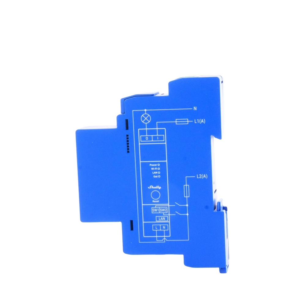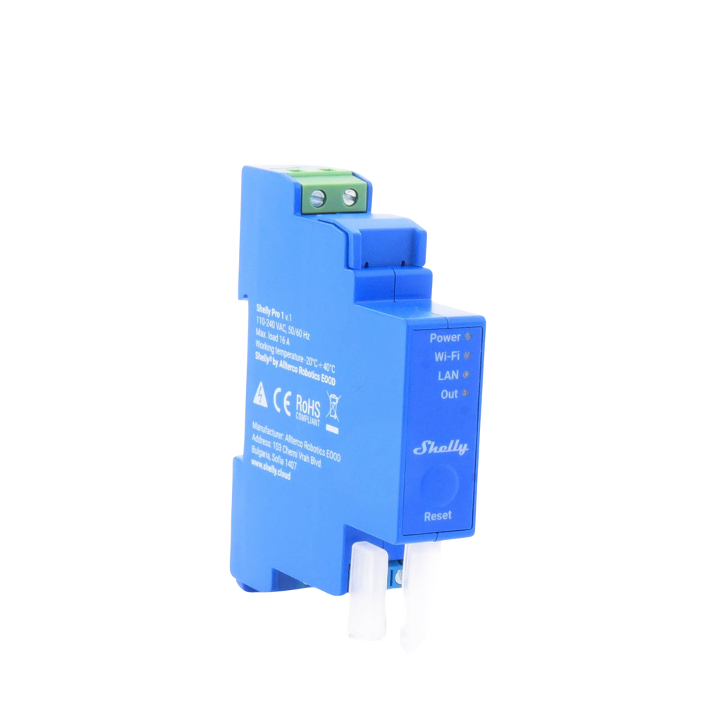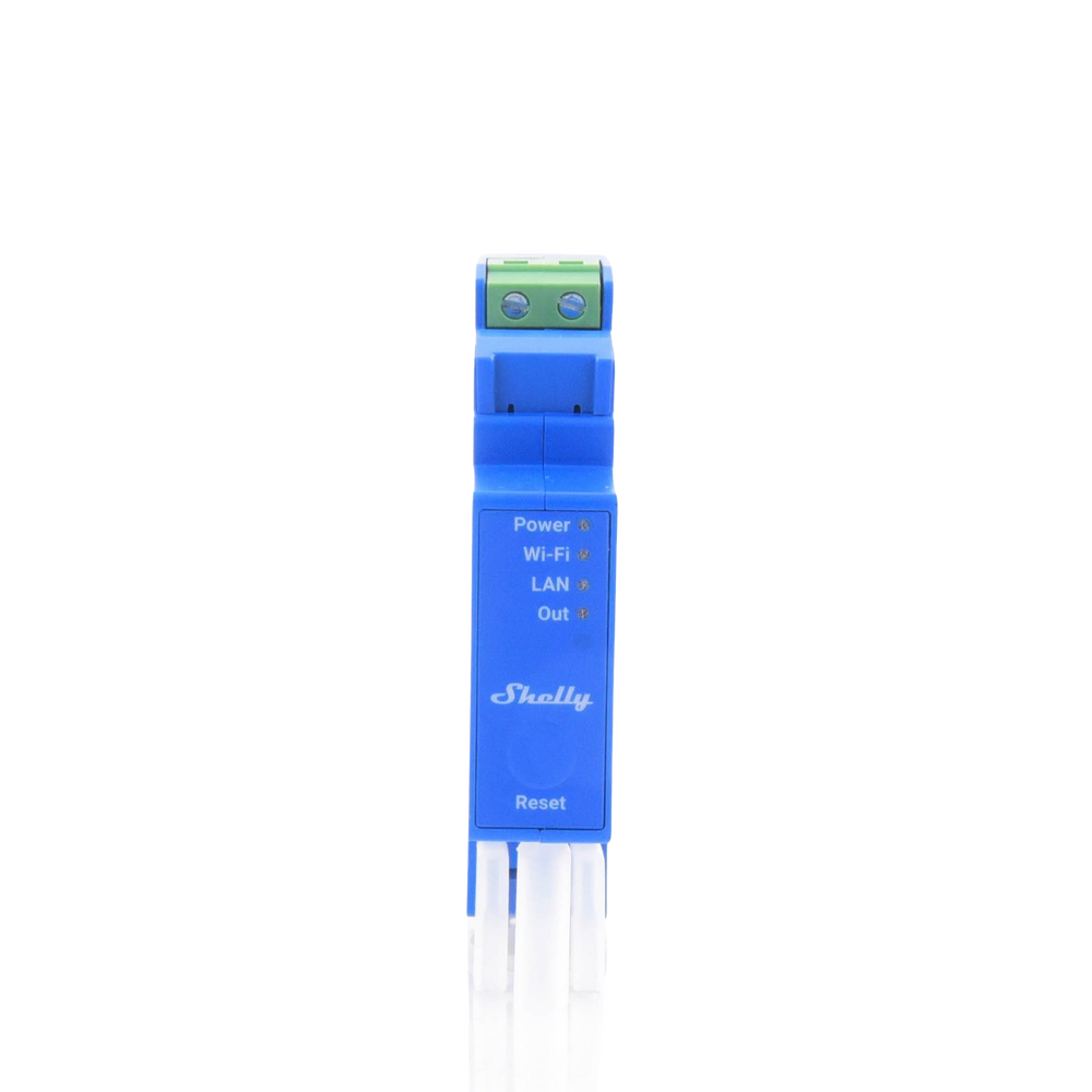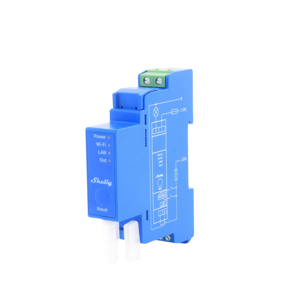 SHELLYPRO1 de 1 canal con conexión Wi-Fi, LAN y Bluetooth, apto para domótica e instalaciones con mando a distancia. Montable en riel DIN dentro de una caja de interruptores. Funciones de seguridad mejoradas y compatible con las plataformas de domótica más utilizadas.