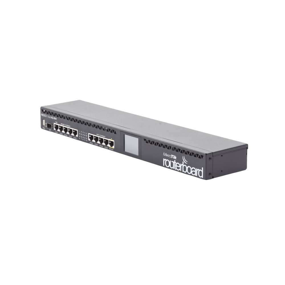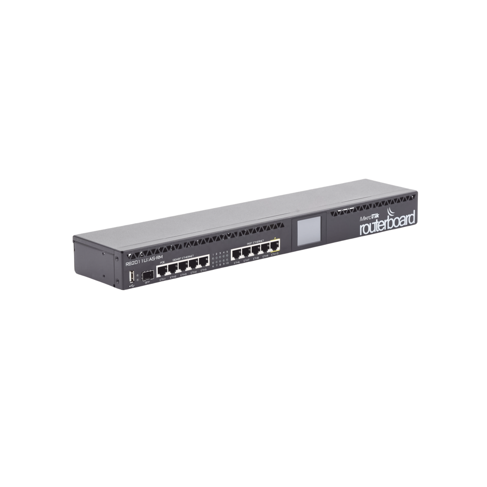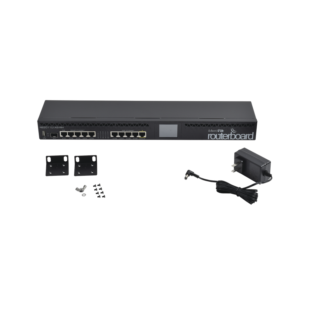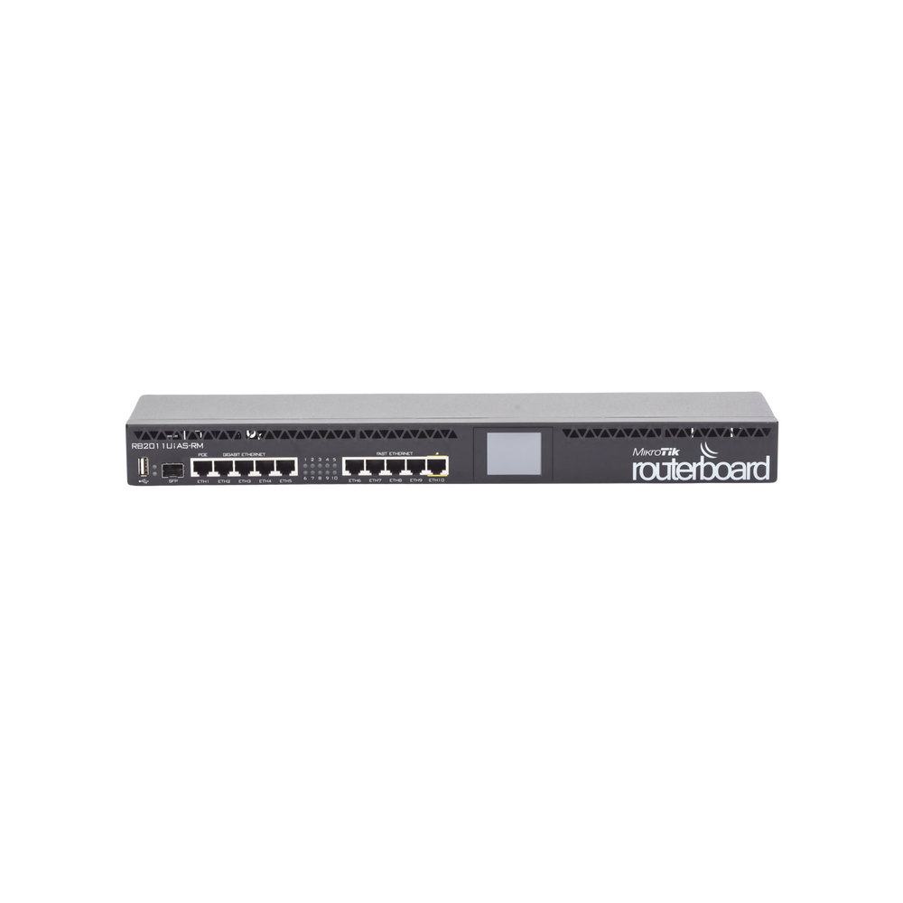 RouterBOARD 2011UiAS-RM, en comparación con la serie RB2011L, no solo tiene cinco puertos Gigabit LAN y cinco puertos Fast Ethernet LAN, sino también un puerto serie RJ45, puerto microUSB y más RAM (128 MB en lugar de 64 MB). Además, tiene licencia RouterOS L5 (en lugar de L4) y una pantalla LCD táctil agradable para la configuración. Un slot SFP (¡el módulo SFP no está incluido!).
