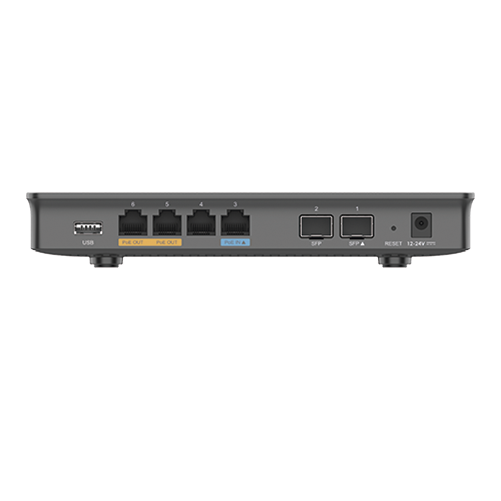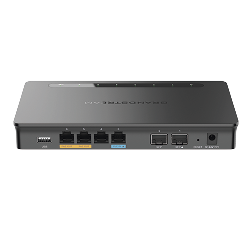 Router Gigabit VPN / Balanceador de cargas / 30,000 sesiones NAT / 4 puertos 10/100/1000 Mbps + 2 puertos SFP (WAN/LAN) / 1 puerto entrada PoE(af/at) / 2 puertos salida PoE (af/at) / Compatible con GWN Cloud.