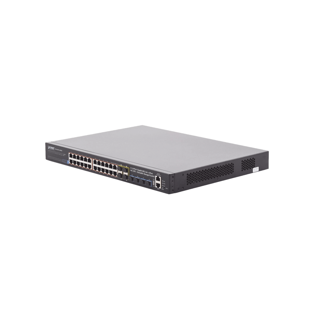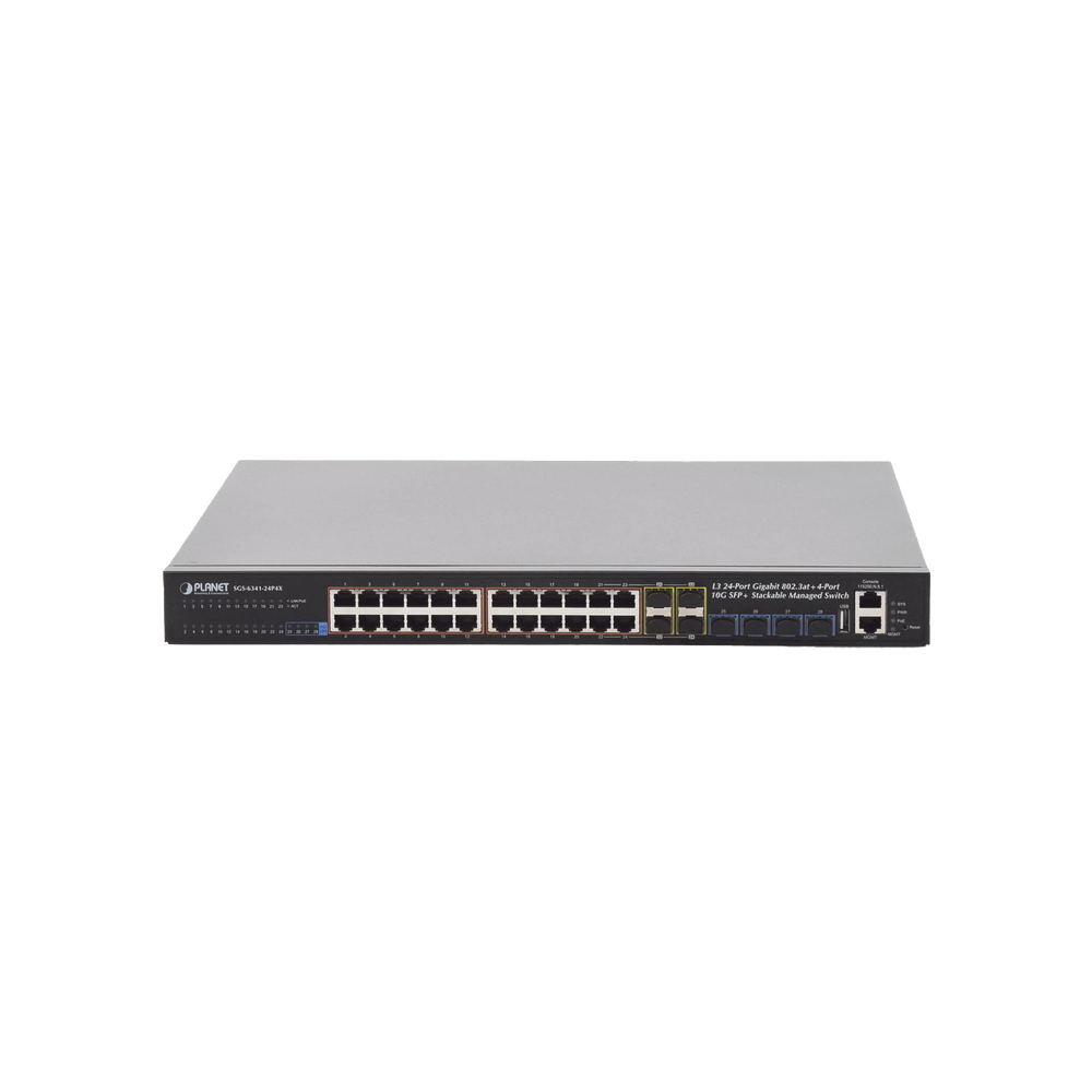 El switch Gigabit gestionado apilable con PoE PLANET SGS-6341-24P4X de capa 3 ofrece un alto rendimiento, enrutamiento estático de capa 3, RIP (Protocolo de Información de Enrutamiento) y OSPF (Primero la Ruta Más Corta Abierta). Con una matriz de conmutación de 128 Gbps, el SGS-6341-24P4X puede gestionar grandes volúmenes de datos en una topología segura, conectándose a la red troncal empresarial o a servidores de alta capacidad. Sus potentes funciones de WRR (Round Robin Ponderado) y seguridad de red permiten al SGS-6341-24P4X un control eficaz del tráfico de datos para aplicaciones de VoIP, transmisión de vídeo y multidifusión en proveedores de servicios de Internet y empresas. El SGS-6341-24P4X cuenta con 24 puertos PoE+ IEEE 802.3at y una potencia PoE de hasta 370 Watts, lo que permite atender redes de videovigilancia IP o VoIP de tamaño mediano a grande a un coste competitivo.