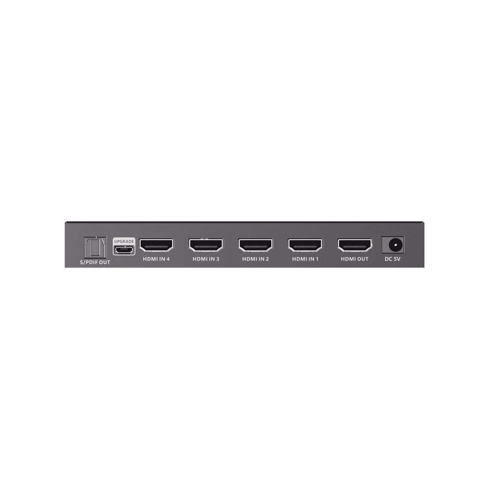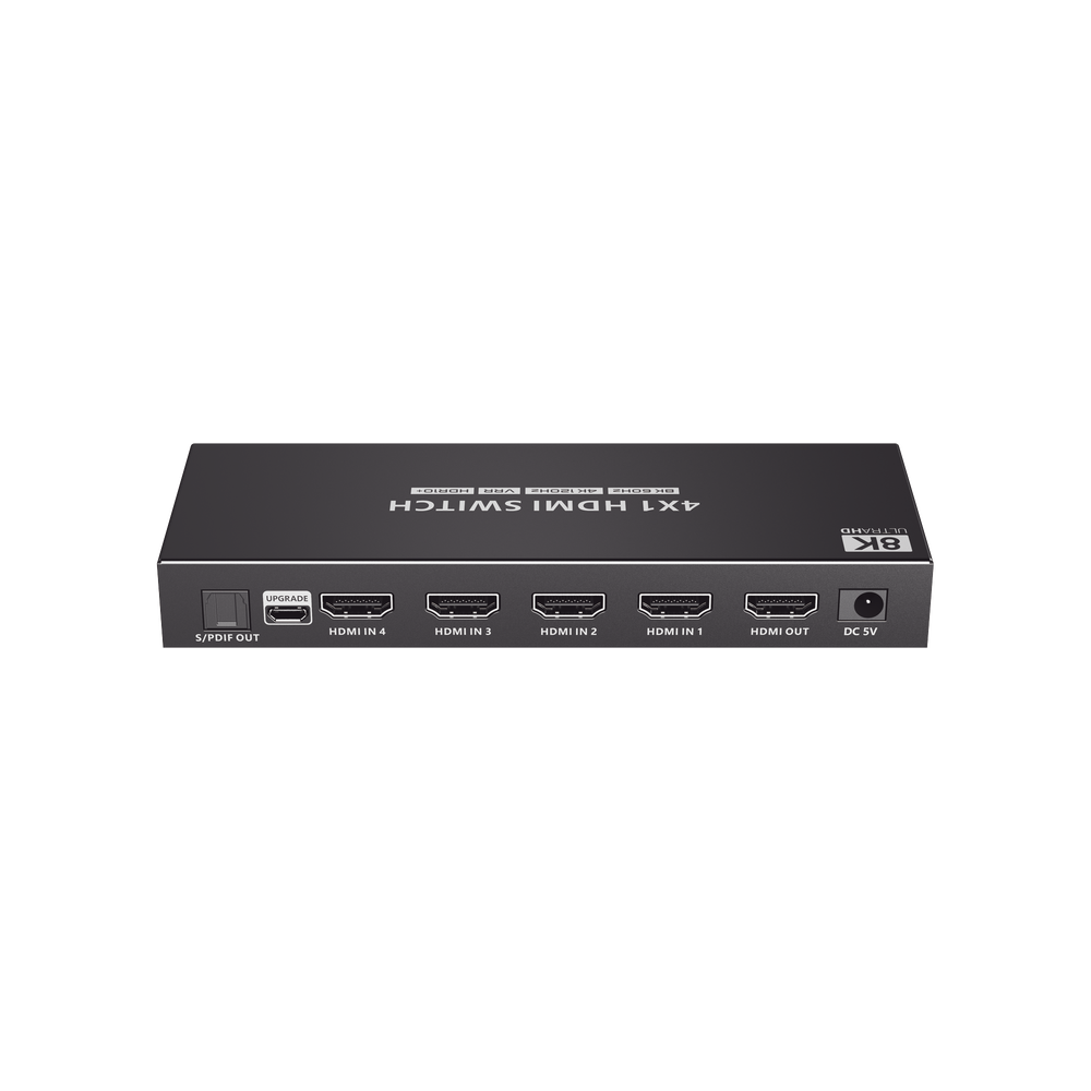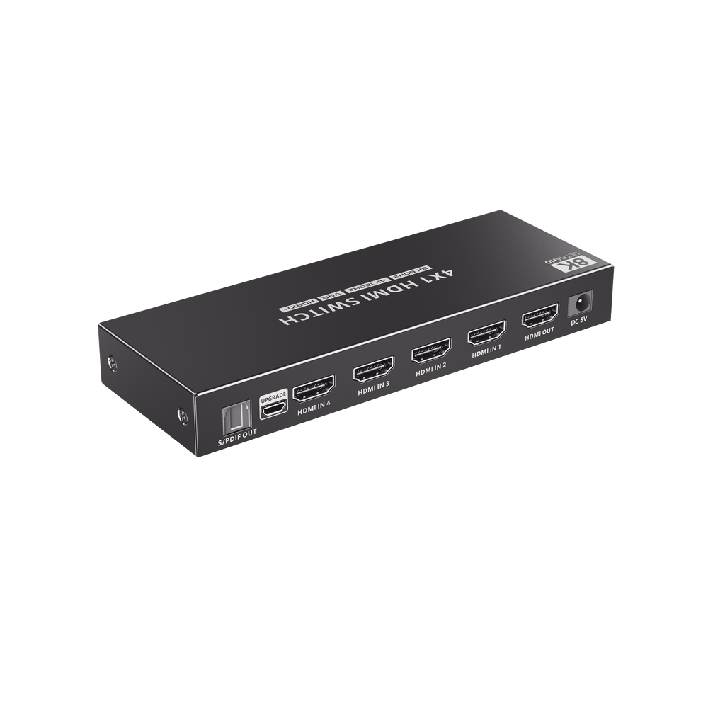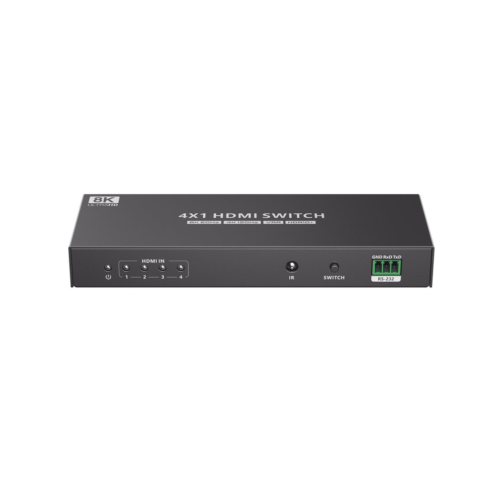Es un dispositivo que permite conectar hasta 4 fuentes de señal HDMI a una pantalla, como por ejemplo televisores o monitores. Este conmutador es capaz de admitir una resolución máxima de 8K@60Hz y también es compatible con resoluciones más bajas. El conmutador ofrece diferentes métodos de control, como un control remoto por infrarrojos y un interruptor RS-232. Estos métodos permiten cambiar fácilmente entre las 4 fuentes de señal HDMI y seleccionar el contenido que se mostrará en la pantalla. Este producto se utiliza en diferentes aplicaciones, como el monitoreo de seguridad, el entretenimiento multimedia, la radiodifusión y los centros de mando.