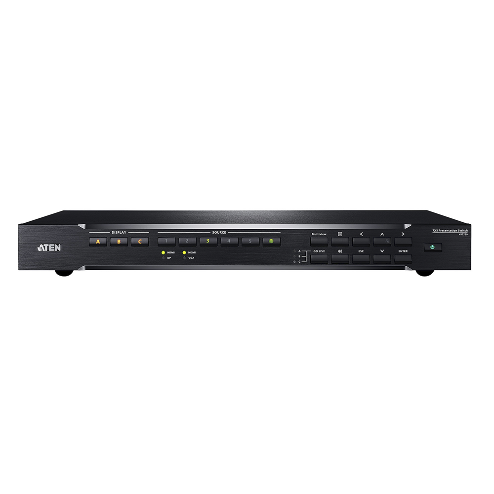 VP2730 es un completo conmutador de presentación que integra un conmutador de matriz de vídeo con funciones de escalador, transmisión, mezclador de audio, extensor HDBaseT y conversor de señal analógica a digital en un dispositivo compacto. Con siete entradas multiformato para dos salidas de alta definición HDMI y una salida HDBaseT, el VP2730 mejora las capacidades de las reuniones de mayor tamaño y facilita la colaboración entre participantes locales y remotos en salas de reuniones, videoconferencias, aulas o clases de formación a distancia.