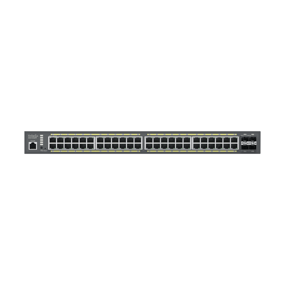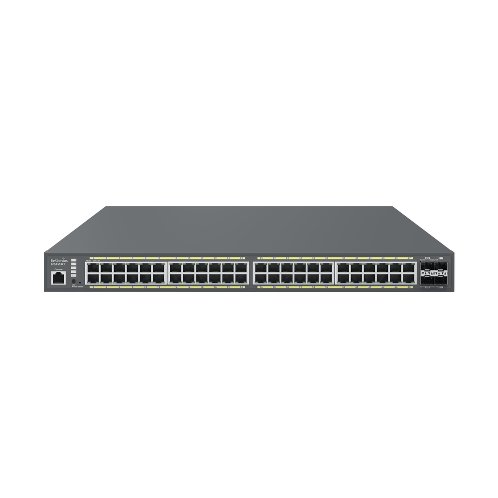 EnGenius Cloud ECS1552FP, un switch Gigabit PoE+ Layer 2+ de 48 puertos con 740 W, 4 puertos de enlace ascendente SFP+ de 10 Gigabit. Las características de clase empresarial optimizan la eficiencia de la red asegurando el máximo rendimiento para los PYMES.