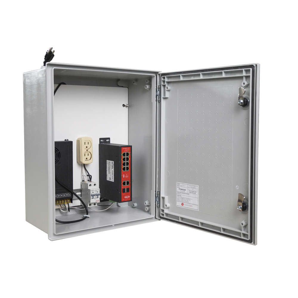 Gabinete de Poliéster con clasificación IP65 para uso en aplicaciones en exterior como postes, torres de telecomunicación o pared donde no se cuente con protección contra lluvia o polvo excesivo.