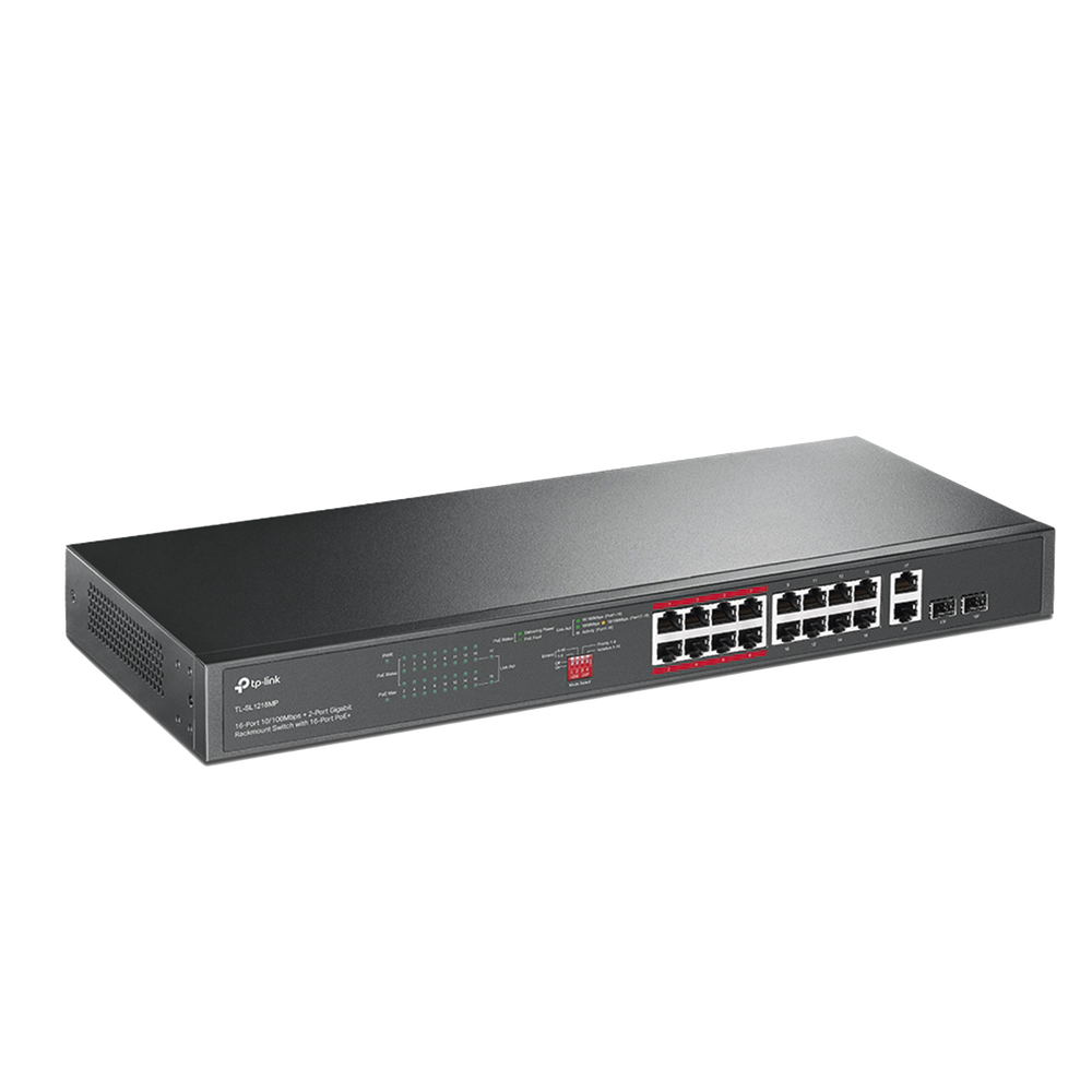Switch PoE+ No Administrable de 16 puertos 10/100 Mbps / 2 puertos 10/100/1000 Mbps en Combo con 2 Puertos SFP / Presuuesto PoE 250 W / Extensor PoE de hasta 250 metros