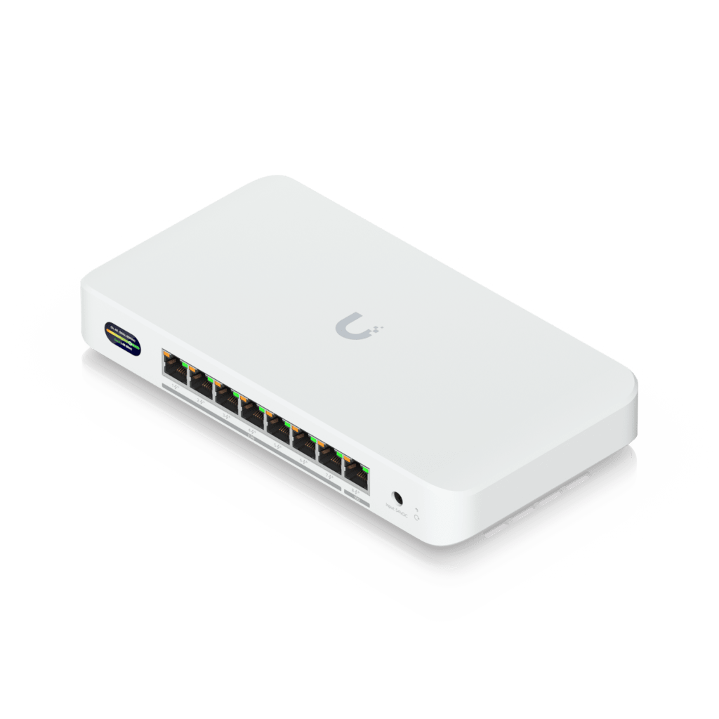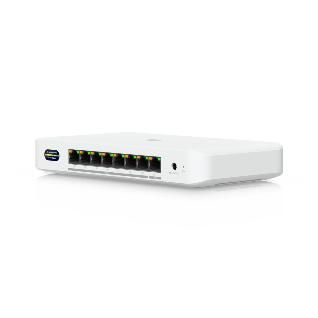 Switch con WiFi 7 integrado para enlaces y distribución de red, con (1) 10 GbE y (7) 2.5 GbE, y (8) puertos PoE+ para alimentar dispositivos, administrable desde UniFi Network.