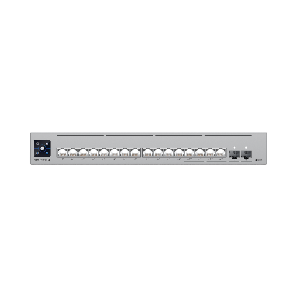 UniFi Switch Pro Max 16 PoE con funciones Capa 3, 16 puertos EtherLight RGB / (4) puertos 2.5 GbE POE++ y (12) puertos GbE POE+ /(2) puertos SFP+ 10G /con pantalla táctil informativa, hasta 180W de presupuesto POE
