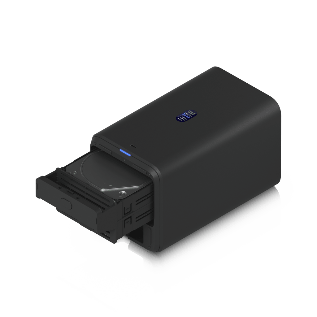 NAS de montaje en escritorio con (2) bahías para discos de 3.5′, puerto 2.5 GbE, alimentación PoE++ y gestión mediante UniFi Drive, con RAID 1 y funciones de respaldo, cifrado y compartición.
