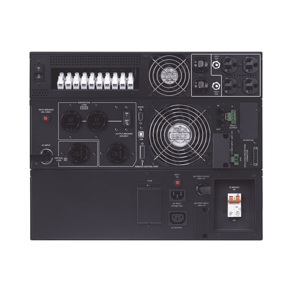 Este UPS compatible con generador incluye paquetes de baterías intercambiables en caliente para mantenimiento sin interrupción de energía y un interruptor de apagado de emergencia (EPO) para permitir a los usuarios apagar el UPS inmediatamente durante una emergencia.